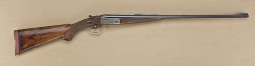High quality European boxlock double rifle, Belgian made, imported by Abercrombie & Fitch, New York. Barrels marked 7.5x30 AK74 on the bottom of each barrel, with full complement of 1950’s to 60’s era Belgianproofs. The barrels measure 26” and are of medium weight and show three-leaf folding rear sight graduating at 50, 100, and 150 years, with raised milled 1/3 rib, raised front sight base which is milled to match.The action is signed “Francotte, Liege”. The boxlock action shows a crossbolt lock, double-triggers, auto ejectors, blue and case hardened finish, lightly scroll engraved, nicely checkered select walnut stocks withfancy checkered panels on each side of action. Modern hard-rubber recoil pad added in European style. The rifle remains in very good plus to near fine condition with 98% plus original blue thinning on edges andsights. The frame and action show 90% plus case hardening just drifting slightly. The stocks are very good plus to near fine with some minor storage marks, slight handling, minor use. Action locks like a bank vault,