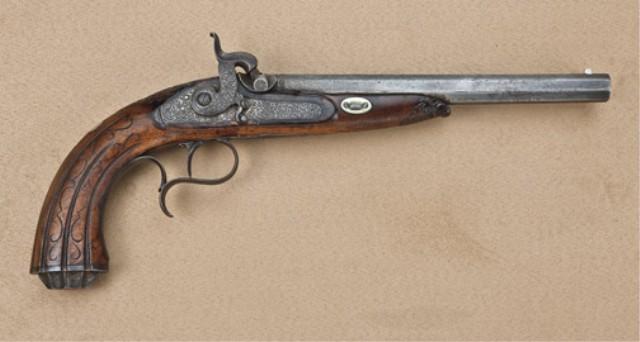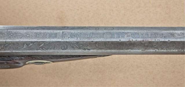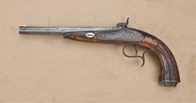 High quality European dueler/target pistol circa approx. 1850, .44 caliber smooth bore. Half stocked. Barrel silver inlaid Hyde & Goodrich, New Orleans. The lock, breech and mounts are highly engraved. The stocks are nicely carved and fluted. The pistol shows a single set trigger. The metal surfaces show a light to moderate erosion and pinprick pitting. The stocks are good, and generally good overall. The front sight is an old hand-made replacement and appears to be silver. Hyde & Goodrich imported the finest European arms and supplied arms to the Confederacy. From the William R. Orbelo Collection. Est: $2,000 - $4,000
