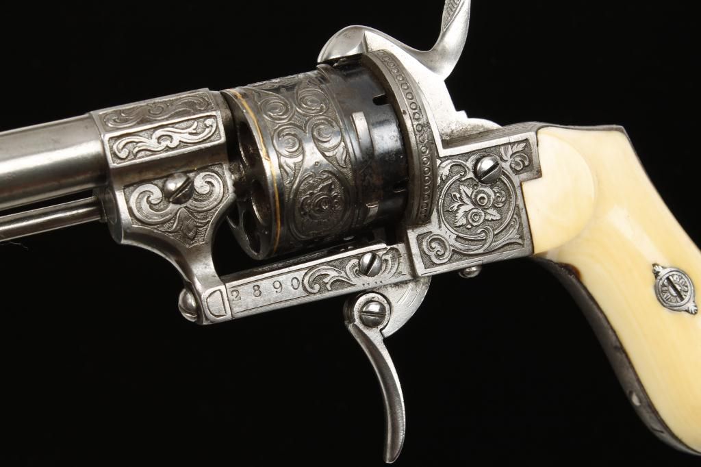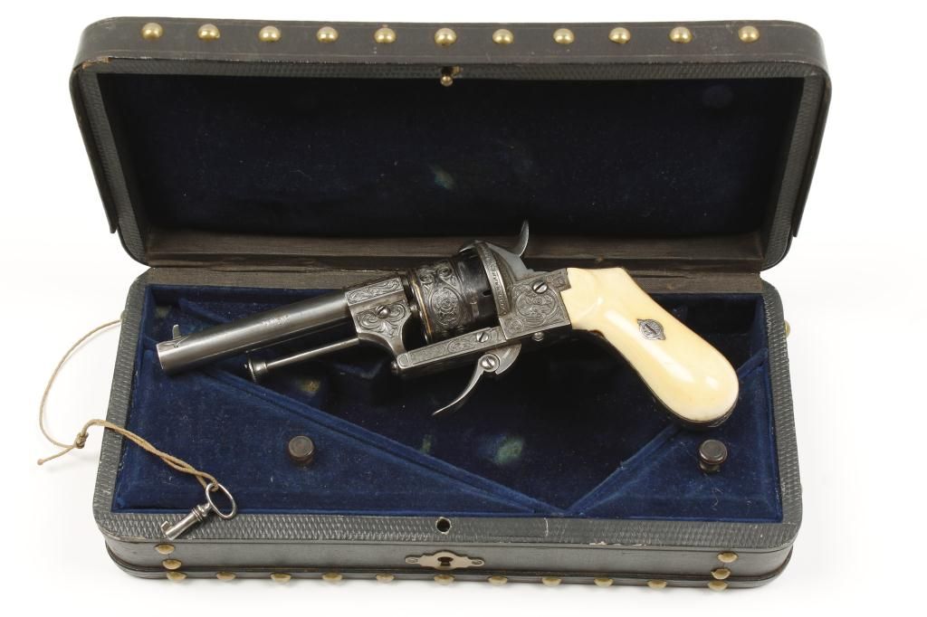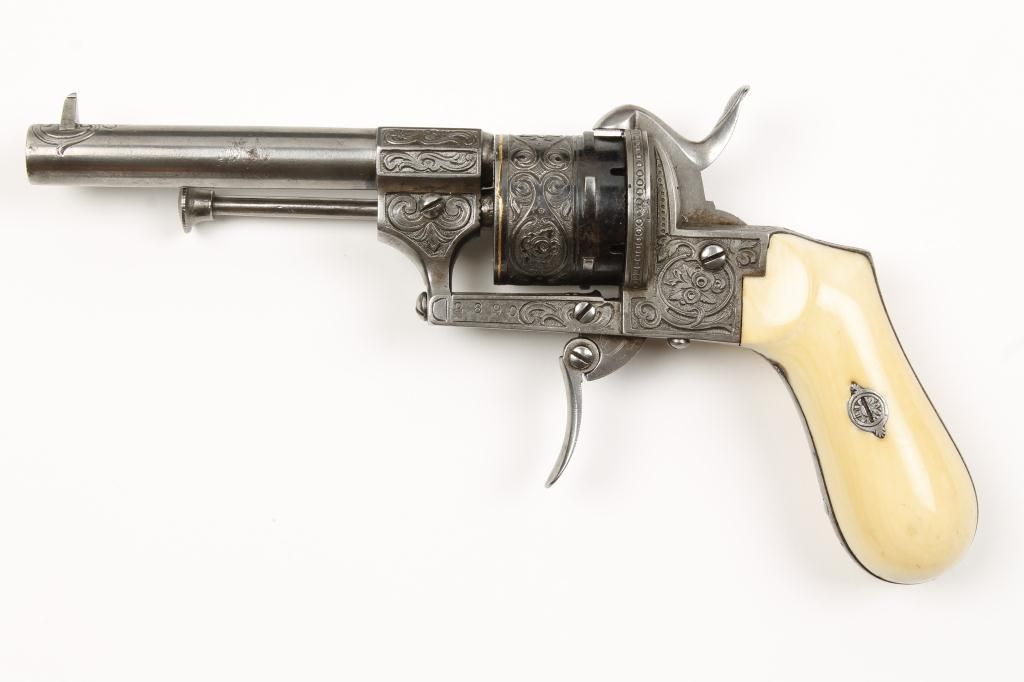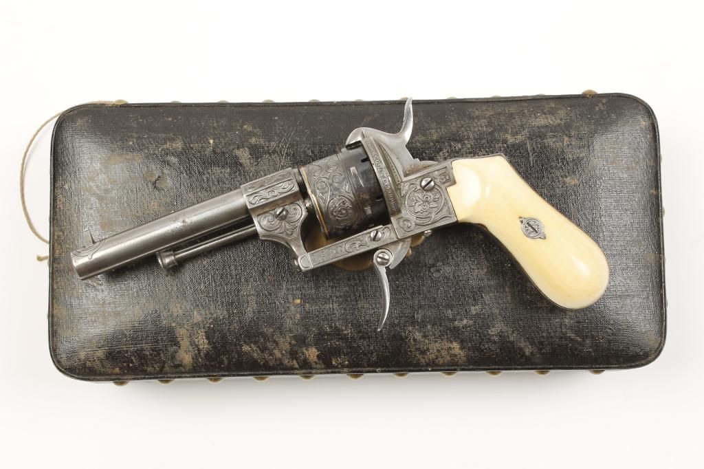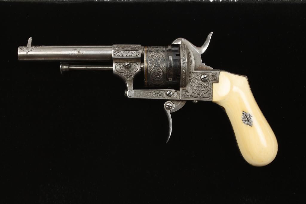 High-quality European pin-fire revolver deep scroll engraved with blued and bright metal finish showing a gold band on the cylinder with ivory grips. Contain in its original to the period French style fitted case, serialnumber 2890. The pistol was finished in French gray or bright metal with a blued cylinder. The pistol shows Belgian proofs and remains in very good condition with just some minor light erosion and starting normalage. The cylinder retains 75% to 85% of its original blue and there is one small area of pitting on the left middle of barrel. The engraving is deeply cut and well executed in florals and scrolls with very fine engravingon the grip screw and escutcheon. The ivory grips are in very good condition with a mellow patina and fit impeccably. The gun measures 8” overall with 3 ¾” barrel of approximately 7.5 mm with a 6 shot cylinder.The right side of the frame is mounted with an ejector rod and a loading gate. The pistol shows a folding trigger. The action works well and is tight. The case is in very good plus to near fine condition and is lined in a