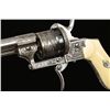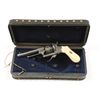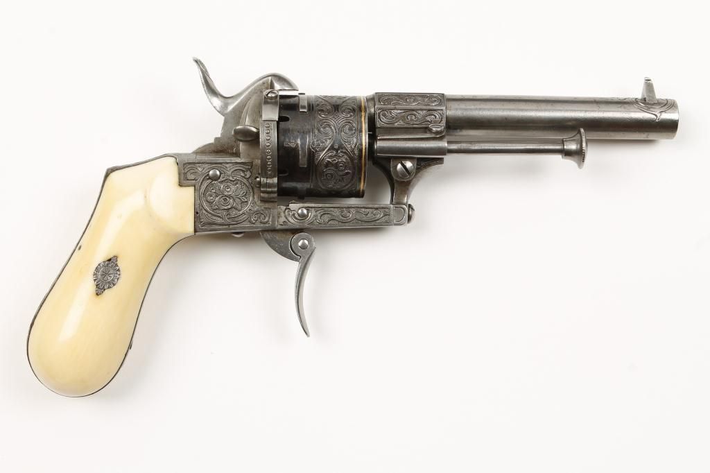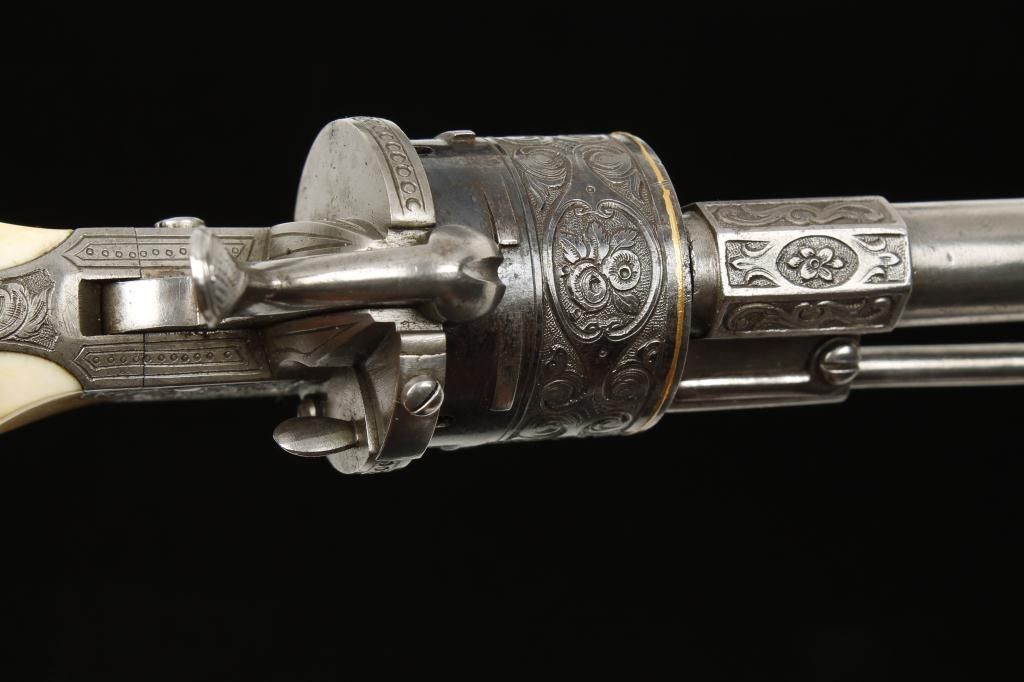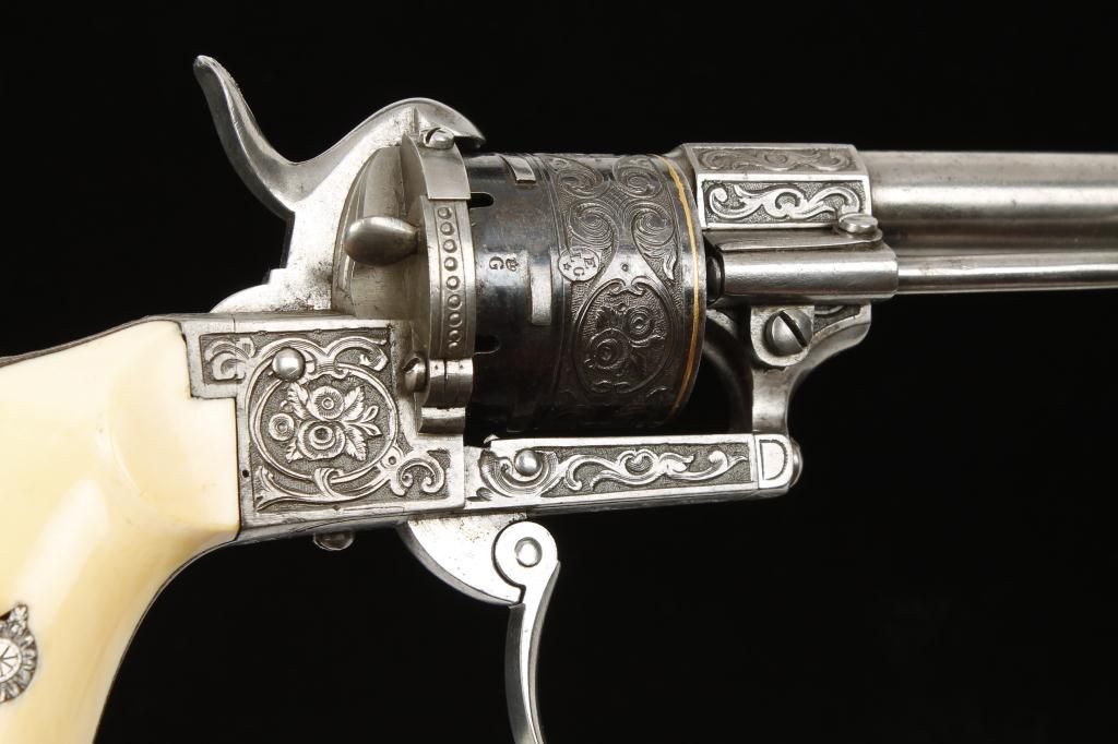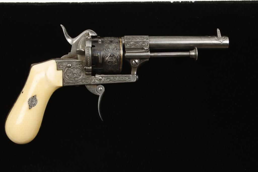 High-quality European pin-fire revolver deep scroll engraved with blued and bright metal finish showing a gold band on the cylinder with ivory grips. Contain in its original to the period French style fitted case, serialnumber 2890. The pistol was finished in French gray or bright metal with a blued cylinder. The pistol shows Belgian proofs and remains in very good condition with just some minor light erosion and starting normalage. The cylinder retains 75% to 85% of its original blue and there is one small area of pitting on the left middle of barrel. The engraving is deeply cut and well executed in florals and scrolls with very fine engravingon the grip screw and escutcheon. The ivory grips are in very good condition with a mellow patina and fit impeccably. The gun measures 8” overall with 3 ¾” barrel of approximately 7.5 mm with a 6 shot cylinder.The right side of the frame is mounted with an ejector rod and a loading gate. The pistol shows a folding trigger. The action works well and is tight. The case is in very good plus to near fine condition and is lined in a
