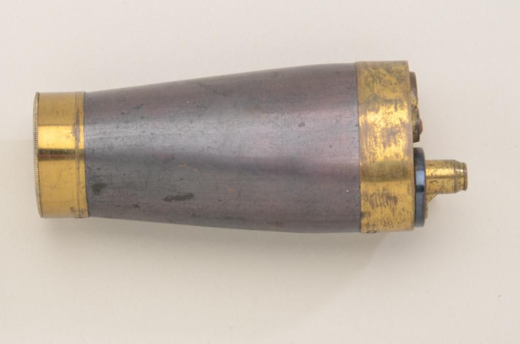 High quality European powder flask with cap compartment and ball compartment, circa 1830 to 1860, type found with dueling pistols, of English origin. The flask measures 4-3/8" and shows a tapered body, approximately1-3/4" to 1-1/4". The body of the flask shows 80-90% lacquer, the spring shows most of its blue, the flask is in very good+ to near fine condition. Est.: $175-$350