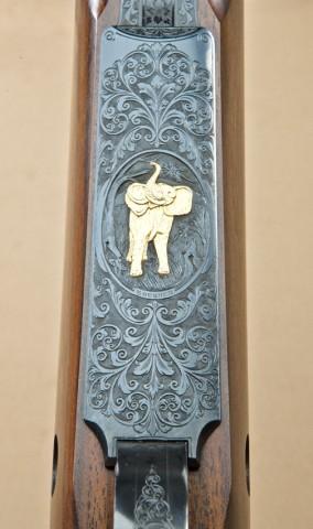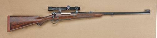 High quality European sporter on model 70 pre-64 Winchester action in 9.3x64 caliber by W. Glaser of Zurich, Switzerland. The rifle shows 26” medium weight barrel, European type V-notch rear sight, quick detachable claw-mounted Weaver 4x scope, finely engraved floor plate with scrolls and large gold inlay of trumpeting elephant. The stock shows straight grain with good quality coarse checkering engraved bolt-handle and fine European workmanship throughout. Shows studs for European type swivels, metal bolt reinforcements in stock. 26” barrel, 47-3/8” overall. Serial #450835. The rifle is fine to excellent as refurbished at time of customization, excellent bore. 9.3 is a favorite European big-game cartridge and Glaser is the most recognized old-time dealer in Zurich. From the Robert Petersen Collection. Est: $1,750 - $3,500