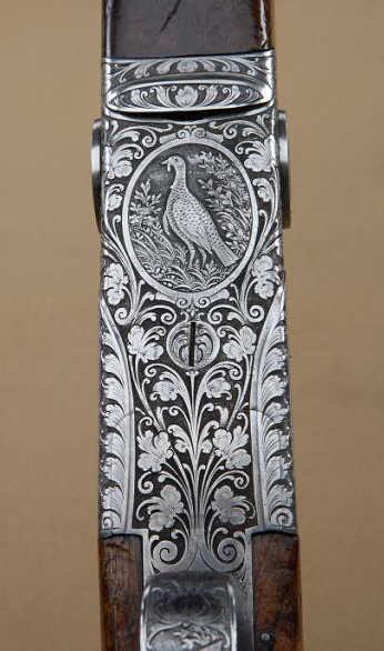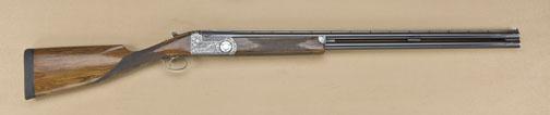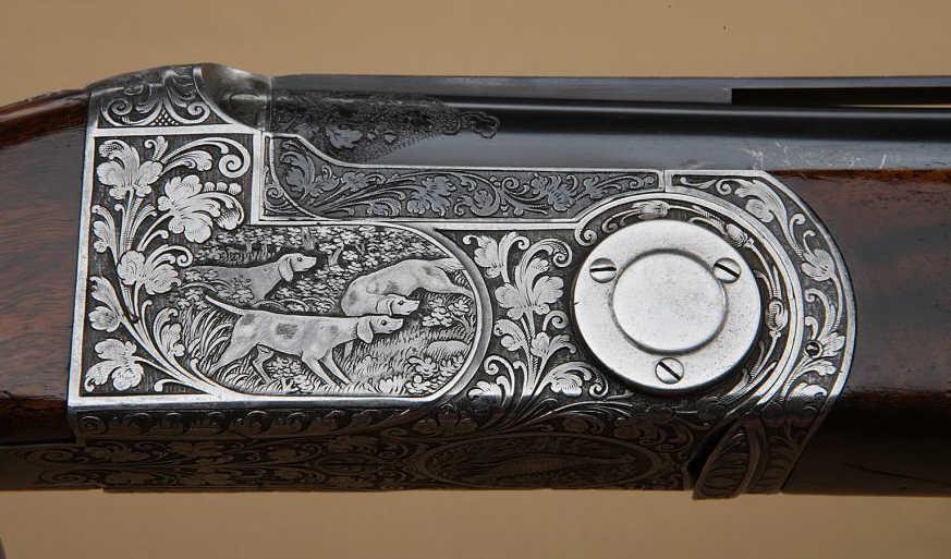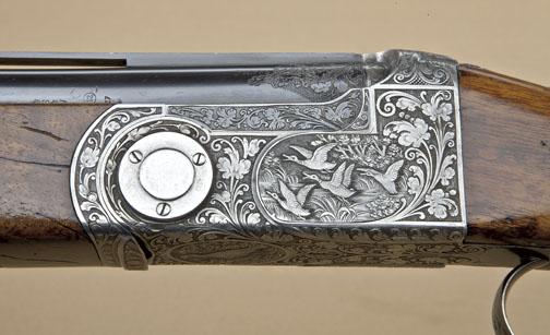 High quality German 12 over/under shotgun, 31-3/8” barrels, with ventilated rib, split barrels, highly engraved action, single trigger, standard extractors, choked “Full” over “Improved Modified”. Serial #31786. 214is engraved on frame. The gun shows German smokeless proofs with, crown “S”, “W”, and “U” and what appears to be a prewar eagle. The gun is equipped with a Miller single trigger and shows the name “G. W. Lindsay,Houston, Texas”, high relief engraved at the breech. The gun is nicely engraved in typical high quality German motifs in scrolls and game birds on frame, triggerguard, and breech. The stock is good quality walnut with select grain checkered in a fancy pattern. The gun shows a very unusual release to forend at front top edge, and reinforced covers over frame pin. (“Built like a tank”). The gun remains in very good to near finecondition with 85-95% original blue. The case hardening has drifted mostly to silver with traces of colors. Stocks are good to very good with some wear to the checkering, minor dings, mars, scratches. Locks tight, bores