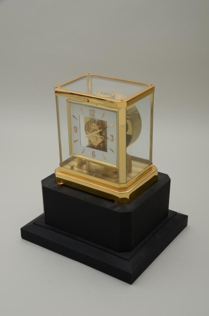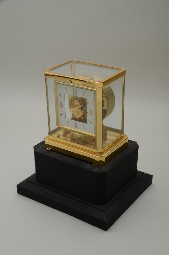High quality Le Coultre perpetual motion window clock with gold plated brass mountings and see-through windows 15 Jewel showing intricate adjustments, serial number 344388. The clock measures approximately 9 ¼” inheight by 5 ¼” width. The clock is mounted on a 6” high base with a presentation plaque affixed to it which reads, “Man Of The Year Award Specialty Equipment Manufacturers Association to Robert E. Petersen” withlengthy inscription about his contribution to the world of wheels and motor sports. (He founded Hot Rod Magazine which started a national movement) dated November 6 1972. From the Robert E. Petersen estate Est.:$900-$1,800.