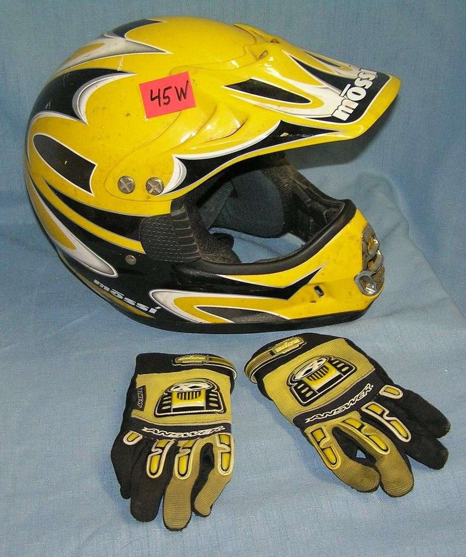 High quality Mossi motor bike racing helmet with a pair of edge answer gloves est. value $75.00-$100.00