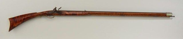 High quality Pennsylvania style Kentucky rifle marked by “Bryan Baker” on side plate. The rifle is stocked in striped maple showing a pronounced fiddleback grain. The stock is incised carved and nicely made with a widebutt and Roman nose. The barrel measures 42” and the rifle is 59” overall. The condition is very good + with some aging on the barrel from storage. The barrel is marked “Sharon Rifled Barrel Co. .45 cal.”. A nice lookingrifle that would be expensive to replicate with this kind of stock. Est.: $600-$1,200.