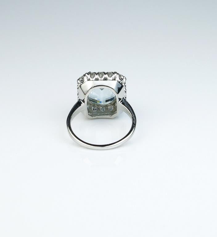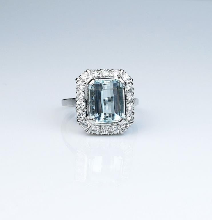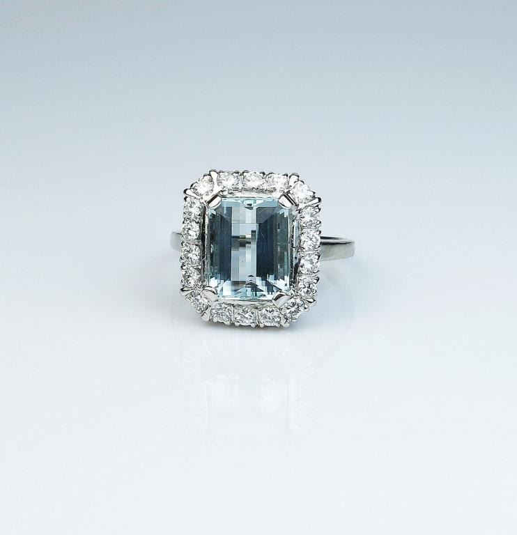 High quality Vintage design ring featuring a fine Aquamarine weighing over 4.00 carats and surrounded by 18 ‘IDEAL’ cut diamonds weighing approx. 1.00 carat of F-G colors and VVS/VS clarity in a 14 karat white goldsetting. Retail; $3,000-$4,000 Estimates $1,800-$2,500 Nice