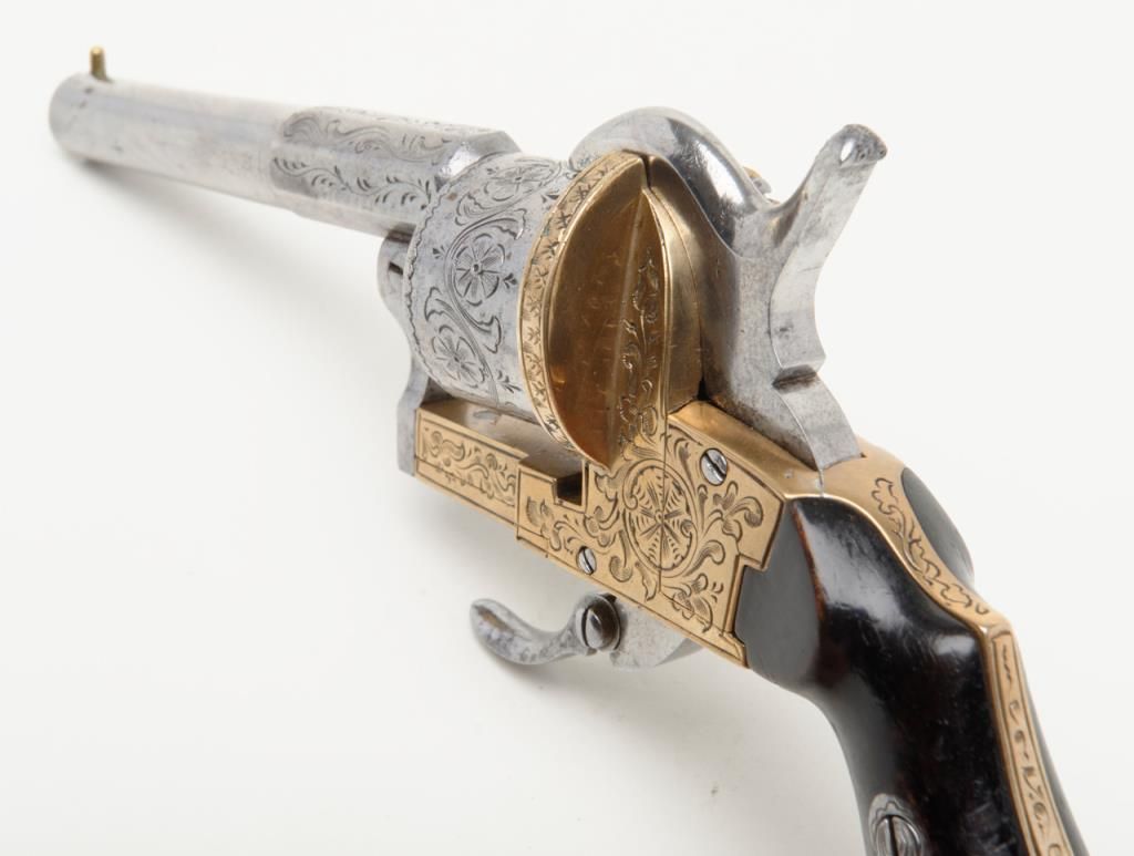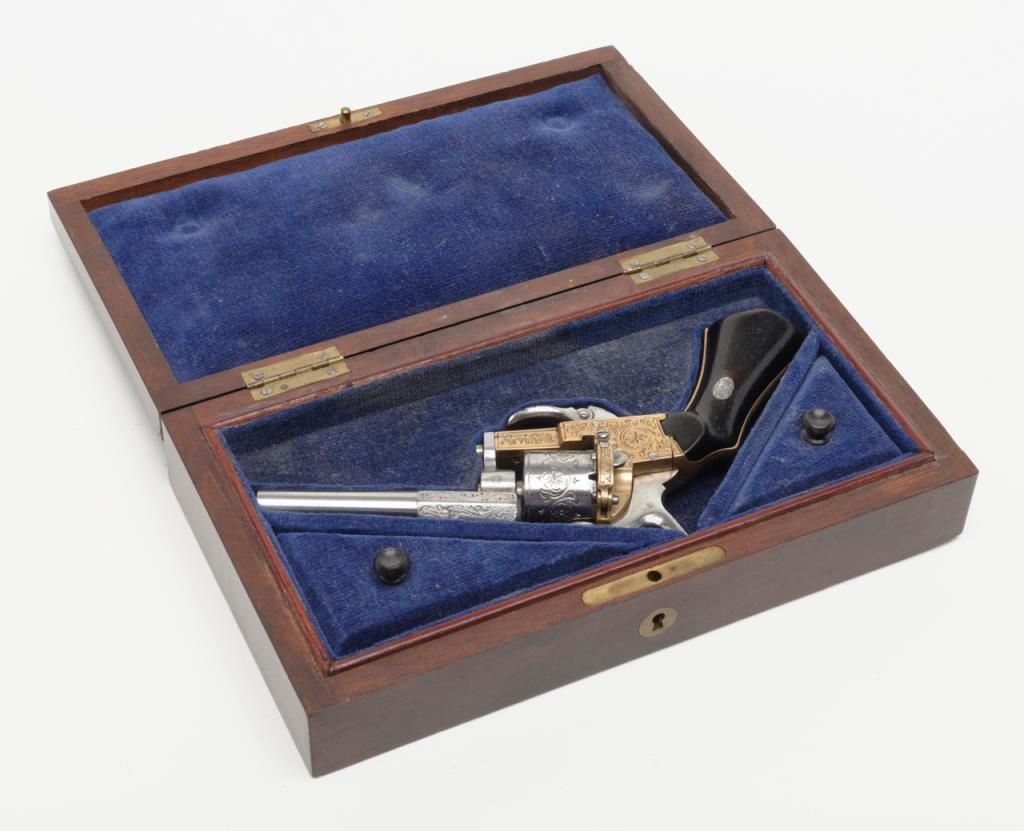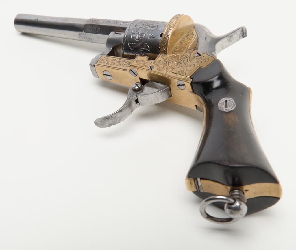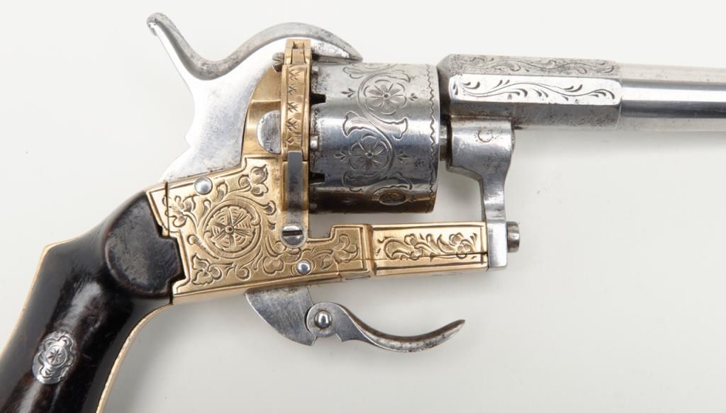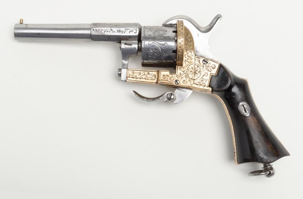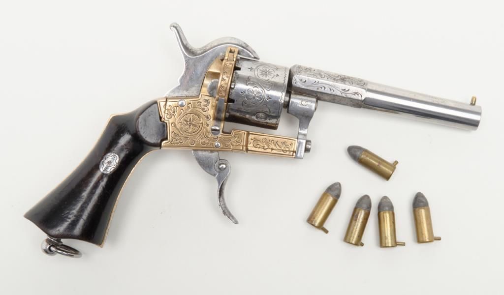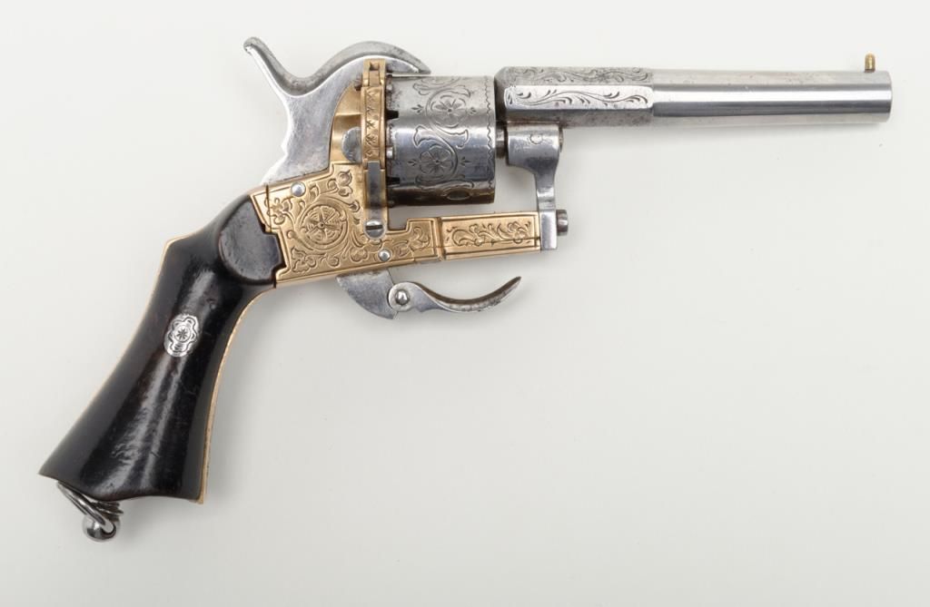 High quality and unusual two tone pinfire revolver in original to the period French style case circa 1860s to 1870s. The unmarked double action revolver is in 7.5 mm pinfire with a six shot cylinder and is nickel plated on the barrel,cylinder, hammer and trigger with engraved and gold plated over brass frame. The elongated grip is oversized. The pistol is devoid of proofs or markings and is good quality. The grips are varnished walnut and are in good condition. Thequality of engraving is good and the action works well. The pistol measures 8 ¼” overall with a 3 ½” barrel. This revolver is cased within its original to the period French style fitted case with 2 compartments. The interior of the case isin very good plus to near fine condition with just some slight fading and normal aging. The exterior of the case is veneered hardwood probably mahogany with brass inlays and in very good condition with just slight normal aging. A mostinteresting and unusual pin fire that actually fits a large hand. Est.: $800-$1600