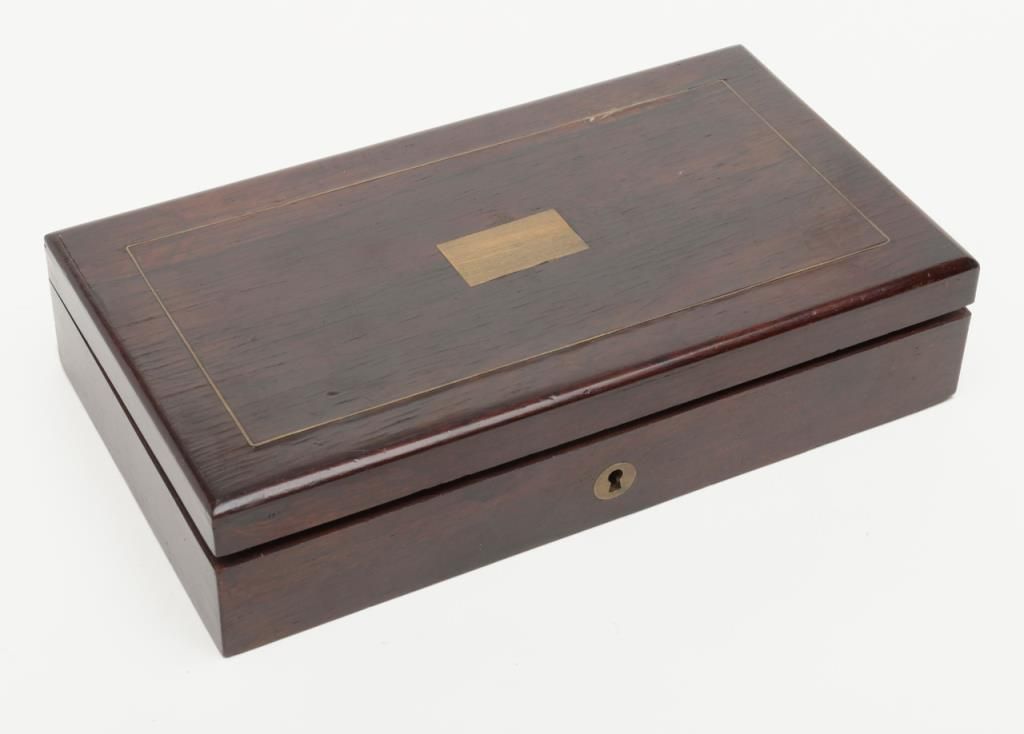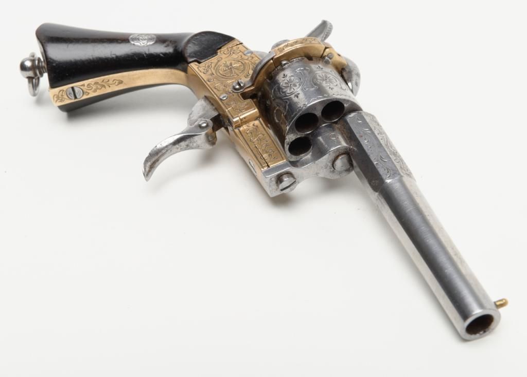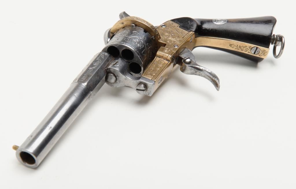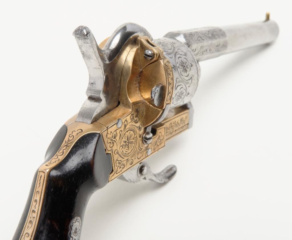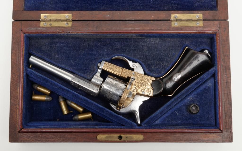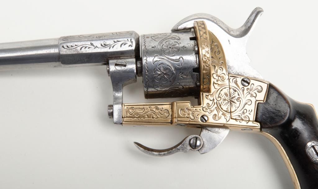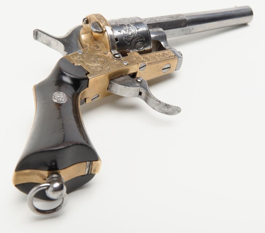 High quality and unusual two tone pinfire revolver in original to the period French style case circa 1860s to 1870s. The unmarked double action revolver is in 7.5 mm pinfire with a six shot cylinder and is nickel plated on the barrel,cylinder, hammer and trigger with engraved and gold plated over brass frame. The elongated grip is oversized. The pistol is devoid of proofs or markings and is good quality. The grips are varnished walnut and are in good condition. Thequality of engraving is good and the action works well. The pistol measures 8 ¼” overall with a 3 ½” barrel. This revolver is cased within its original to the period French style fitted case with 2 compartments. The interior of the case isin very good plus to near fine condition with just some slight fading and normal aging. The exterior of the case is veneered hardwood probably mahogany with brass inlays and in very good condition with just slight normal aging. A mostinteresting and unusual pin fire that actually fits a large hand. Est.: $800-$1600