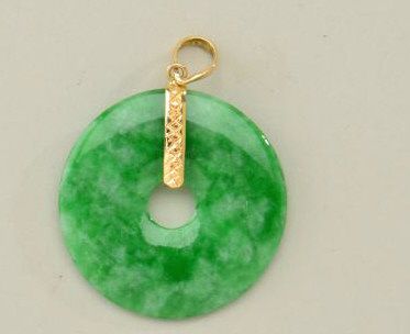 High quality beautiful green jade circle pendant with a 14k yellow gold clasp. Est. $500-$650