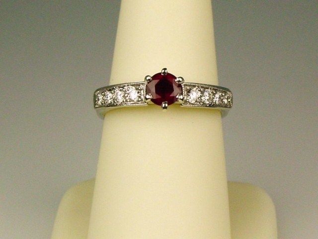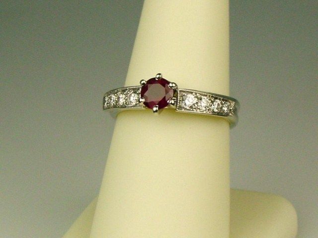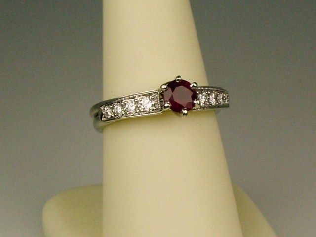 High quality classic 14 karat white gold ladies ring set with a fine pigeon blood Ruby weighing approx. 0.80 carats and bead set with 8 round ‘IDEAL’ cut diamonds weighing approx. 0.25 carats of F-G colors and VSclarity. Retail $2,000-$2,500 Estimate $1,500-$2,000 A fine item