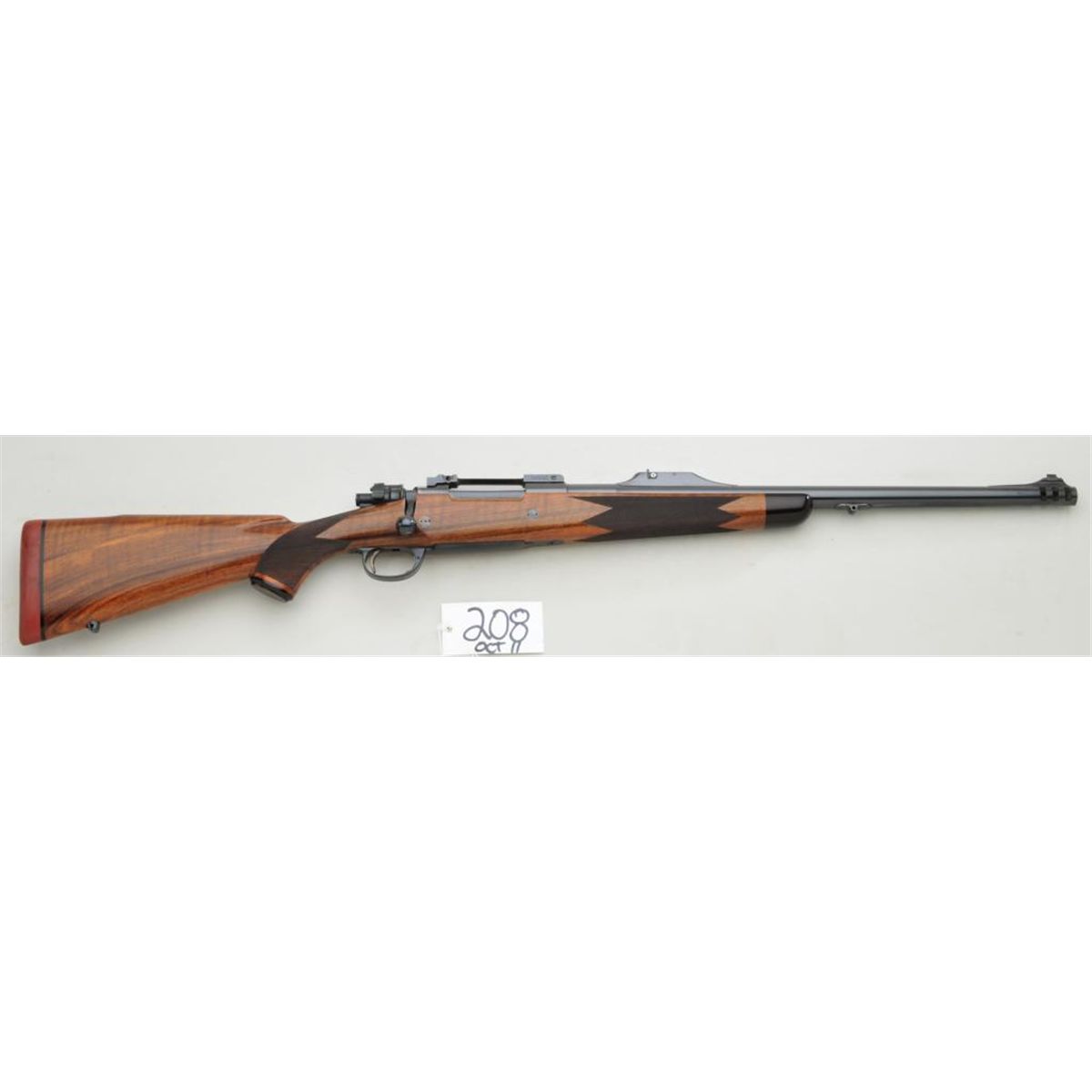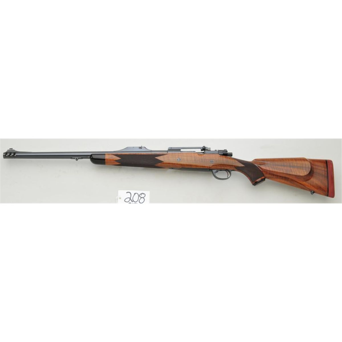 High-quality custom African sporting carbine signed Walter Abe Riflemaker LA California, .460 Van Horn caliber on Mauser action, serial #10. The carbine measures 42” overall, 22” compensated barrel, raised rear sightramp with adjustable iron rear sight, ramp front sight, barrel magna ported at end. The rifle is nicely stocked in select grain walnut, beautifully checkered with bolted stock and case-hardened small parts. Therifle is mounted with Buhler mounts for scope. The rifle shows minor use and storage, approx. 98%. The action is fully worked. An extremely fine quality sporter custom made with Africa in mind. From the Robert Petersen collection. Est: $2,500 - $5,000