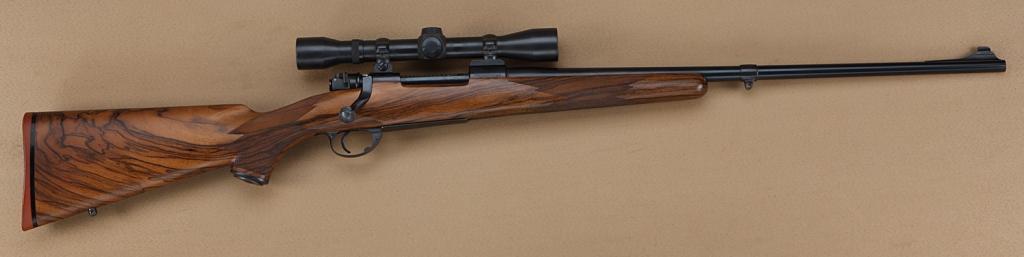 High-quality custom sporting rifle of CZ-made Mauser action, 7x57 caliber, beautifully stocked in fine grained deluxe walnut, serial #1823E4. The rifle shows a master-grade rust blue finish and weaver scope, Redfieldmounts blued to match. The action has been worked and turned. The stock quality is excellent and the gun shows allen wrench release trigger-guard and floorplate. The only visible screw on the gun is the boltrelease. The stock measures 14” to the end of the wood, 14-3/4” to the end of the hard rubber recoil pad. The gun is in fine to excellent condition and shows a satin finish to the stock, just some slight handling andpossibly minor use. 97-99% with a great bore. Although not signed, the quality of the work is excellent and is the quality of work Mr. Petersen appreciated. From the Robert Petersen collection. Est: $1,250 - $2,500
