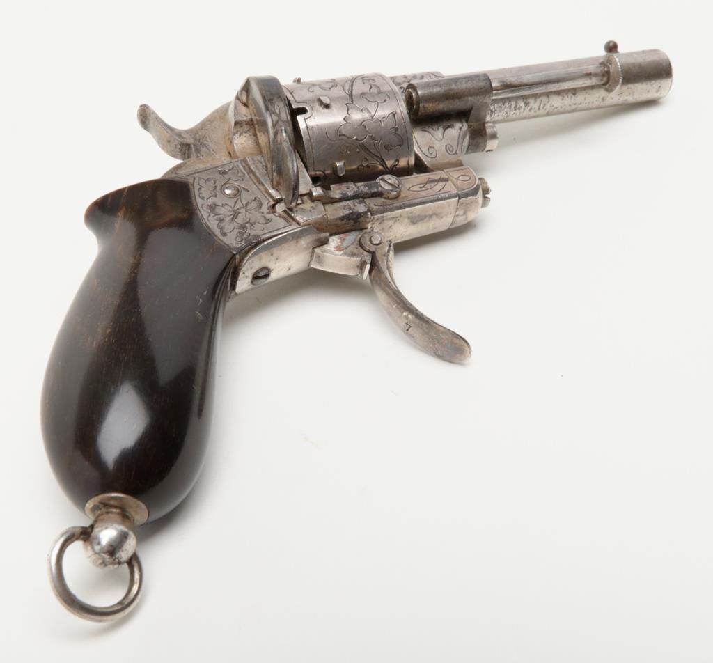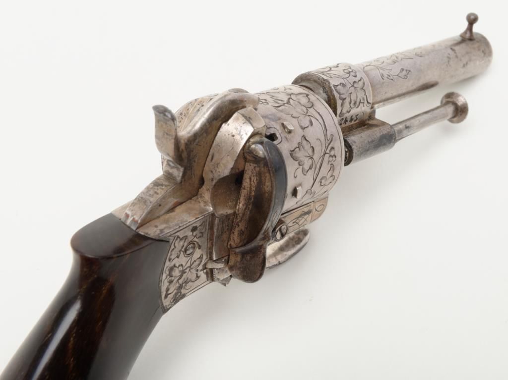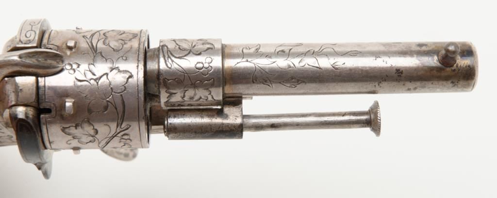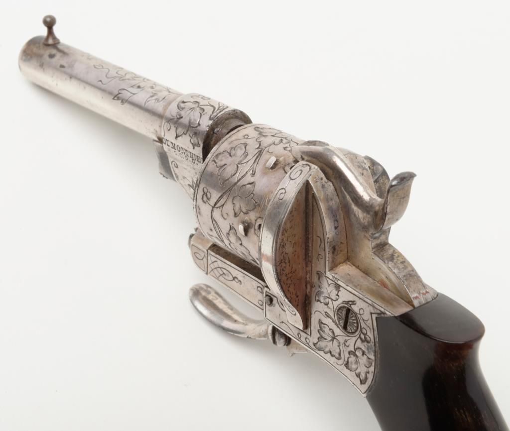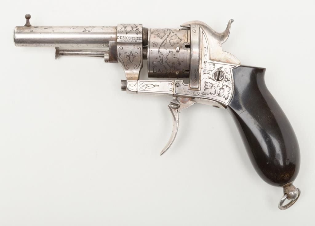 High quality double action pinfire revolver marked “Dumonthier” showing light floral engraving and full silver plate with polished horn grips, serial number 2443. The pistol measures approximately 7 ¼” overall with 3” barrel of approximately 8 mmpinfire with 6 shot cylinder. Approximately 90% to 95% plus unpolished original silver finish remains showing just some natural patina and aging. The dark horn grips are fine to near excellent with just a couple of small marks andvery slight losses. The condition is fine to near excellent overall and the action works perfectly. Dumonthier was a very high quality and famous French maker known for his knife pistols and oddities. The styling and quality are both highquality and somewhat unique especially with the overall odd shape and horn grip. Est.: $600-$1200