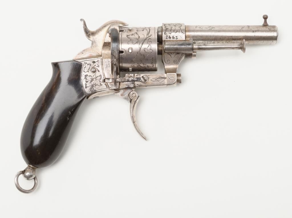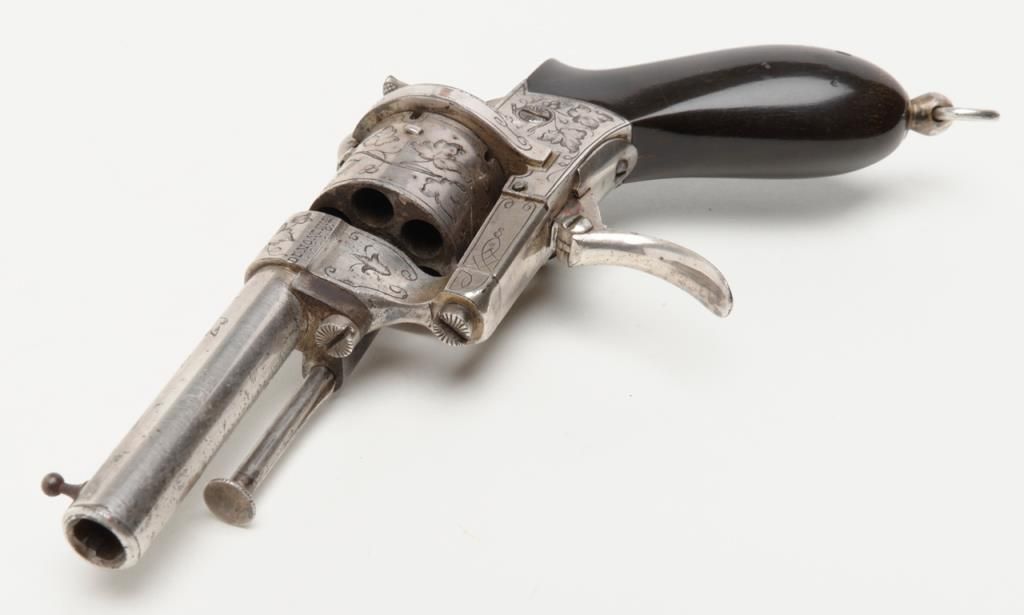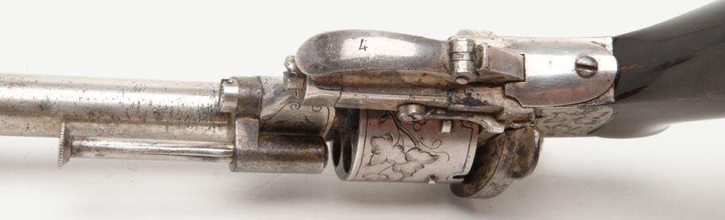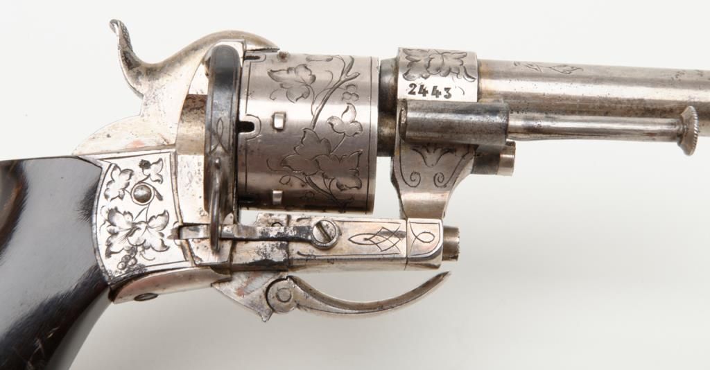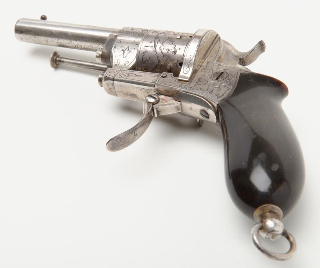 High quality double action pinfire revolver marked “Dumonthier” showing light floral engraving and full silver plate with polished horn grips, serial number 2443. The pistol measures approximately 7 ¼” overall with 3” barrel of approximately 8 mmpinfire with 6 shot cylinder. Approximately 90% to 95% plus unpolished original silver finish remains showing just some natural patina and aging. The dark horn grips are fine to near excellent with just a couple of small marks andvery slight losses. The condition is fine to near excellent overall and the action works perfectly. Dumonthier was a very high quality and famous French maker known for his knife pistols and oddities. The styling and quality are both highquality and somewhat unique especially with the overall odd shape and horn grip. Est.: $600-$1200