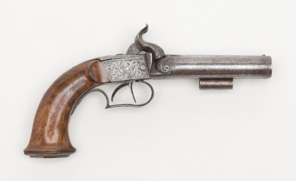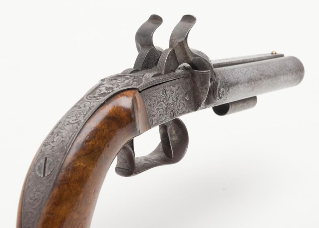 High quality double barrel percussion pistol by Anton Escherich of Baltimore, Maryland showing strong German influence to style and engraving. The pistol measures 8 ½” overall with 3 ¼” barrels of approximately .54 caliber smooth. The rib isnicely signed to script with makers name and city. The tang is deeply chiseled engraved showing a figure of a man carrying a fowl and a portrait of Hunter is also deeply chiseled and engraved on the trigger guard. The frame and mounts are nicelyscroll engraved as accents to the chiseled panels. The condition is very good plus with a light gray to brown patina and just some slight beginning normal coloring and age. The stock is a varnished light-colored wood with a slightly striped grain.Possibly maple or fruit wood. The action works well and the ramrod is missing. A most unusual American-made pistol dating about 1840s-50s. Est.: $600-$1200