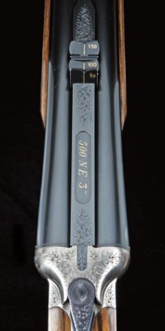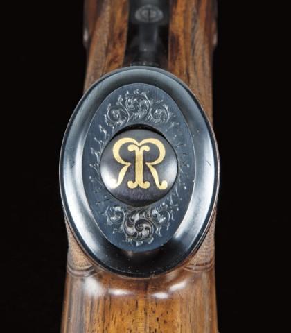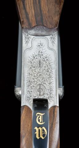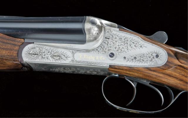 High quality double rifle by J. Rigby & Co, Paso Robles, CA, 500 nitro express, 3” chambers, full sidelock action, selective ejectors, blue and french grey finish, select checkered figured walnut stock, 24-7/8” heavy barrels, 3-leaf folding rear sights with flush gold inlay and accents. The action mounts are nicely engraved, the trigger guard and grip cap show initials T.W. on triggerguard and R.I.R. cipher or brand on pistol grip. Cap shows a hinged compartment for extra sights or screws. The gun remains in fine to near excellent original condign, showing 90-95% plus original finish, slight handling and use, and is near new. Serial #480615 on interior. Est: $20,000-40,000.