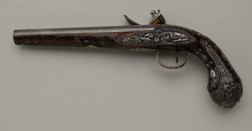 High quality flintlock pistol with ornate high relief cast silver mounts and profusely silver inlaid stock, circa 1810-1830. The pistol measures 14” overall, 8-1/4” round barrel of approx. 68 caliber; the barrelshows a fine Damascus pattern and the lock is nicely engraved; the mounts are cast in high relief and scenes of arms, flags, cannon and etc.; the stock is profusely inlaid with wire and floral plaques that are handengraved. The condition is very good + to near fine with a slight coating of spray lacquer, no sanding or appreciable wear; the inlay is 90-95% intact with only slight loss; the top jaw and screw are restorations andthe lock is otherwise original. There are no markings on the pistol other than what appear to be French proofs on the rear of the breech on the left side. Est.: $2,500-$5,000.