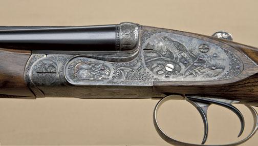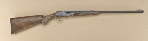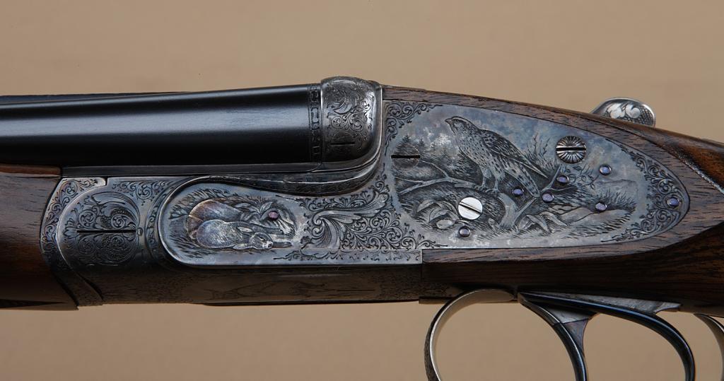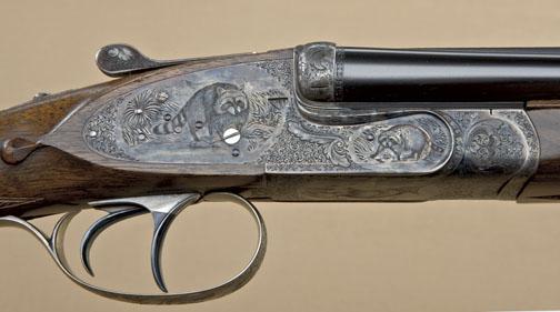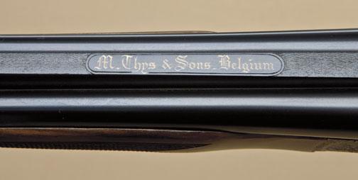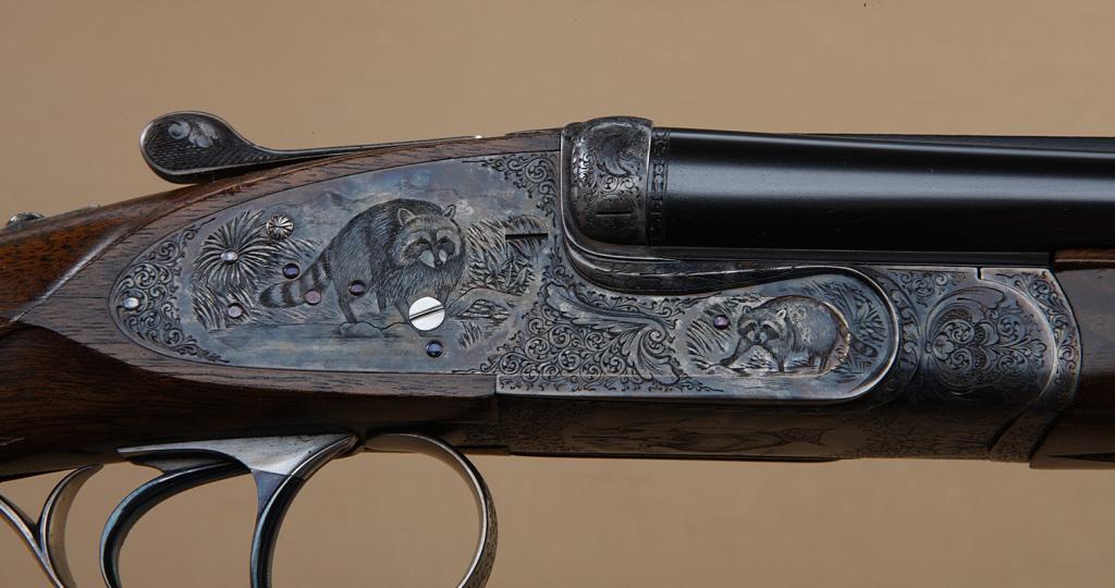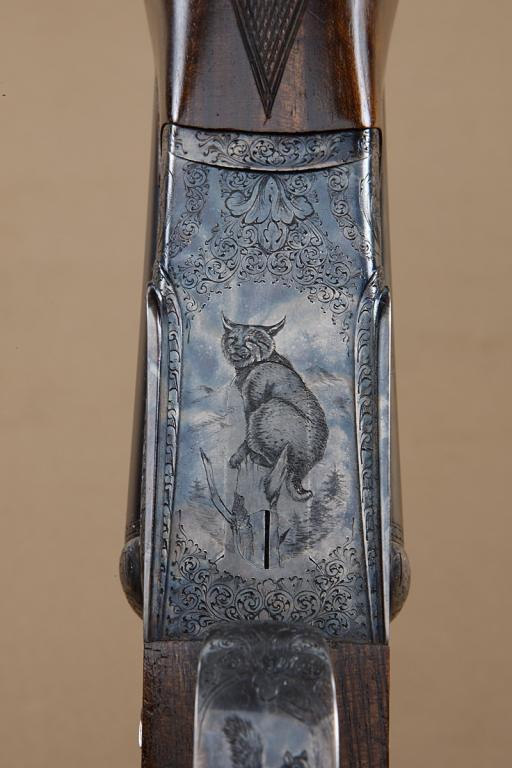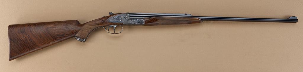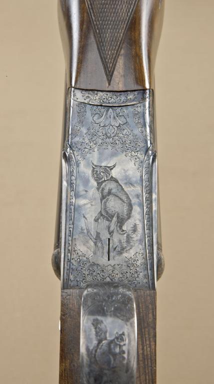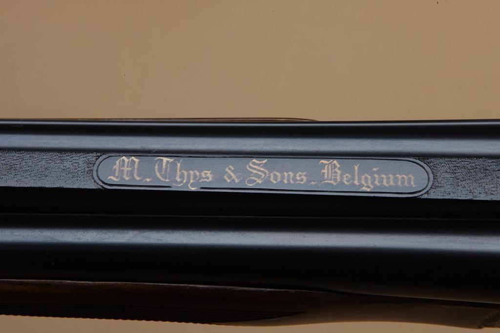 High quality full-sidelock double rifle by M. Thys & Sons of Belgium, .22LR caliber, finely engraved blue and case hardened finish, with highest quality workmanship throughout. Serial #0124. The rifle shows 24” barrels, with hand-filed raised rib with gold Thys signature and v-notch rear sight. Engraved front sight and engraved ramp. The frame shows falcon on left with downed rabbit surrounded by scroll. The bottom of theframe shows a lynx with whimsical expression. The triggerguard shows scroll, the right side of the frame shows two cute raccoons. The panels are surrounded by scrolls. The rifle shows a semi-beavertail forend, squarepistol grip, with extended inner tang, and metal pistol grip cap with hinged trap which is engraved to match. The gun is stocked in select walnut of light color, probably French, with expert checkering, satin finish, checkered butt. The rifle shows a hinged or articulated front trigger and automatic ejectors. The stock measures nearly 15-1/4” from the front trigger to the end of the checkered wood butt. The rifle shows 99% plus