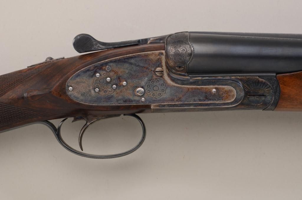 High quality full sidelock shotgun, Model 56 by Aguirre & Aranzabl of Eibar, Spain, 12 gauge, 3" magnum, single trigger, auto ejectors, beavertail forend, in luggage type case with label in lid. The gun shows 30"barrels, non-ventilated rib, choked improved modified right, full left; with English style straight stock and high quality features throughout. The sidelock actions are finely engraved with tight scrolls and florals. The gun is nicely stocked in burl walnut and nicely checkered. The stock measures 14" to the end of the wood, 14-7/8" to the end of the English style pad. The barrel shows importer marks of William "Bill" Moore ofWestlake, California, who handled the finest quality Eibar arms. The gun remains in fine to near excellent condition showing just minor use, excellent bores, 98%+ blue and case hardening, stocks also fine. The caseis in very good condition with some minor scuffs and slight traveling marks. The high quality Spanish arms have become expensive since the rise of the Euro and the fall of the dollar. We estimate retail replacement