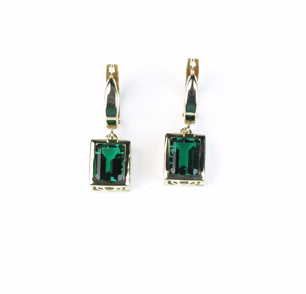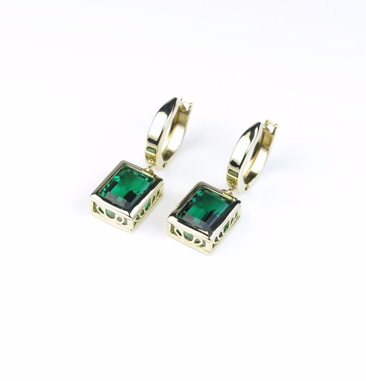 High quality ladies earrings featuring two extra fine matching Chatham created emeralds weighing approx. 4.00 carats bezel set in a 14 karat yellow gold custom made settings. Nice Estimates $800-$1,200