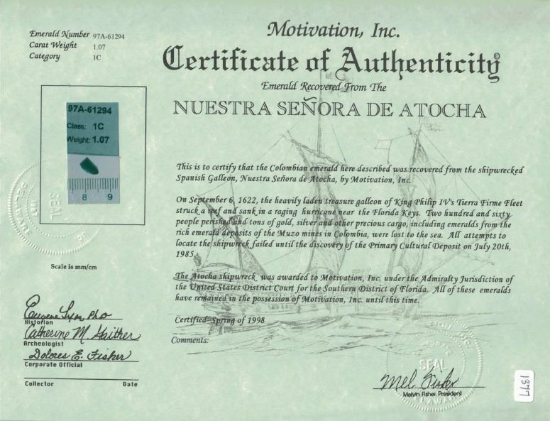 High-quality natural emerald, 1.07 carats, grade 1C, ex-Atocha (1622). Roughly 1/2" x 1/4". Small, deep green cylindrical crystal with whitish sediment covering parts of the outside From the Atocha (1622), with Fisher plastic tag and photo-certificate #97A-61294, plus appraisal and letter.
