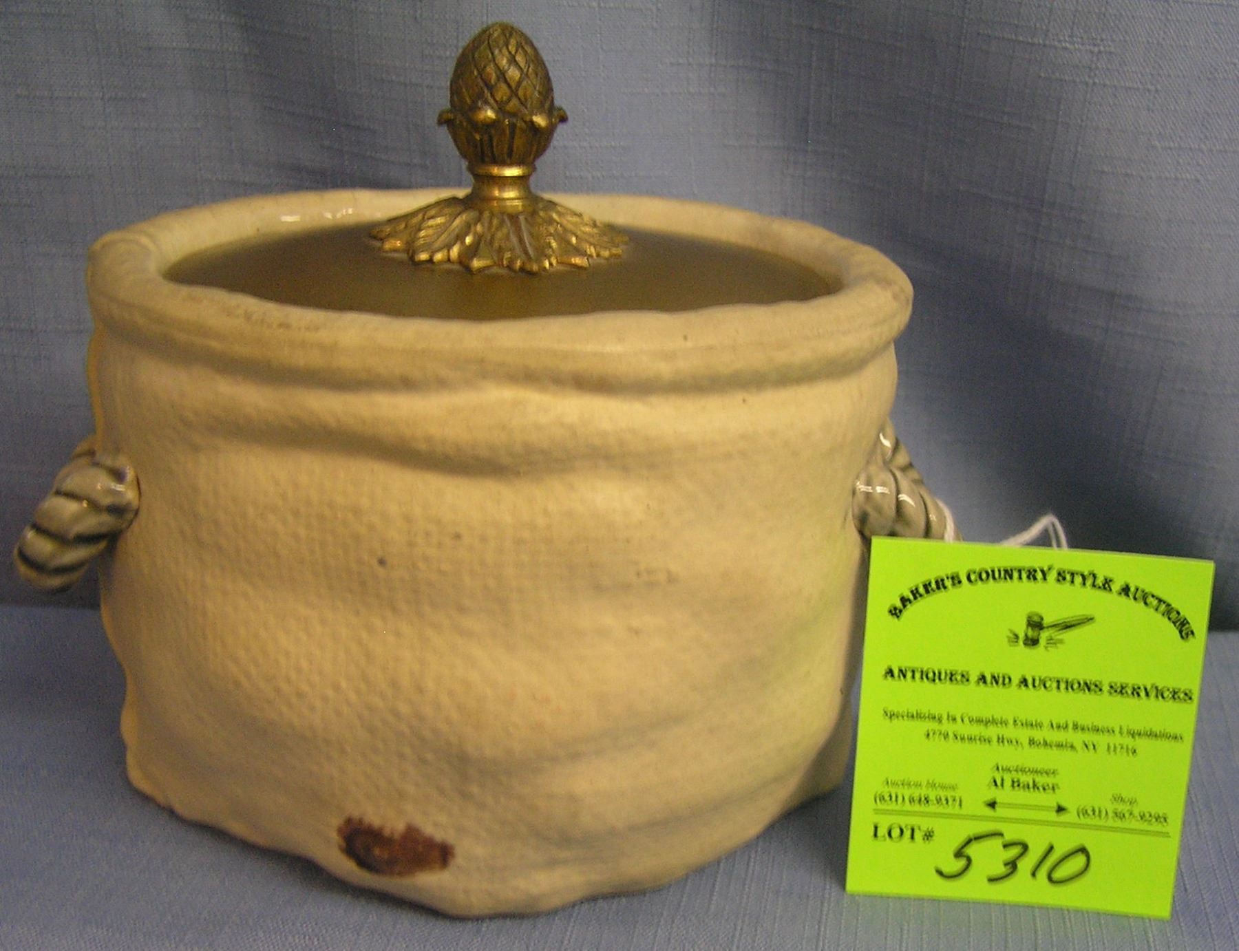 High quality porcelain tobacco jar with brass cover est. value $150.00-$200.00