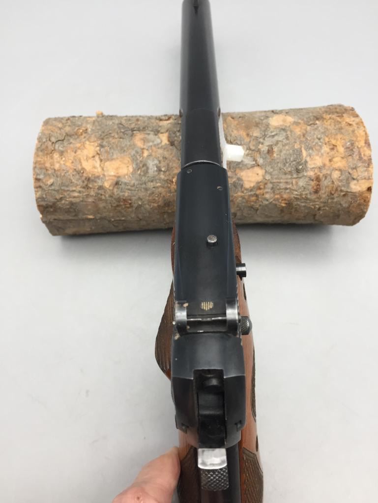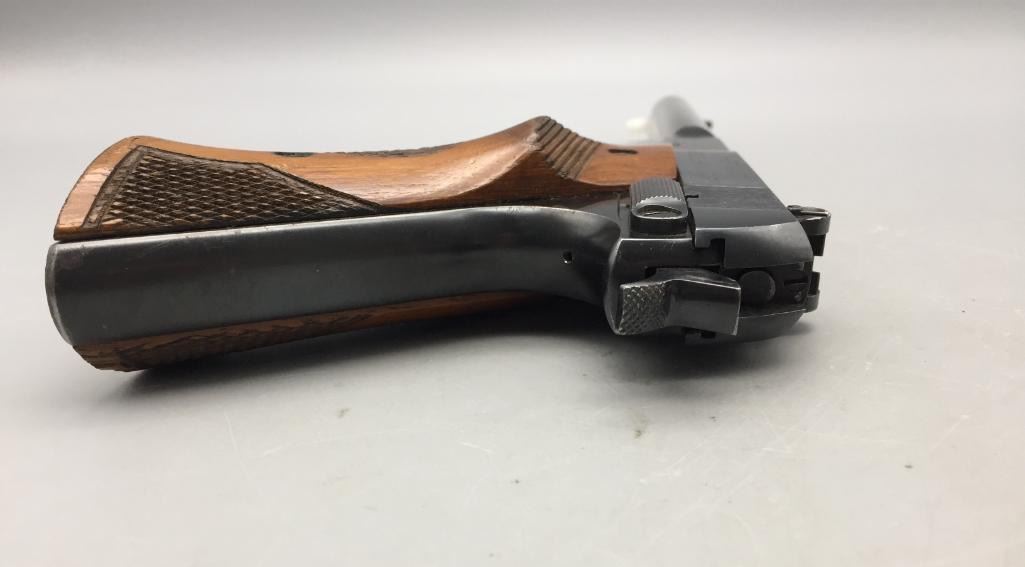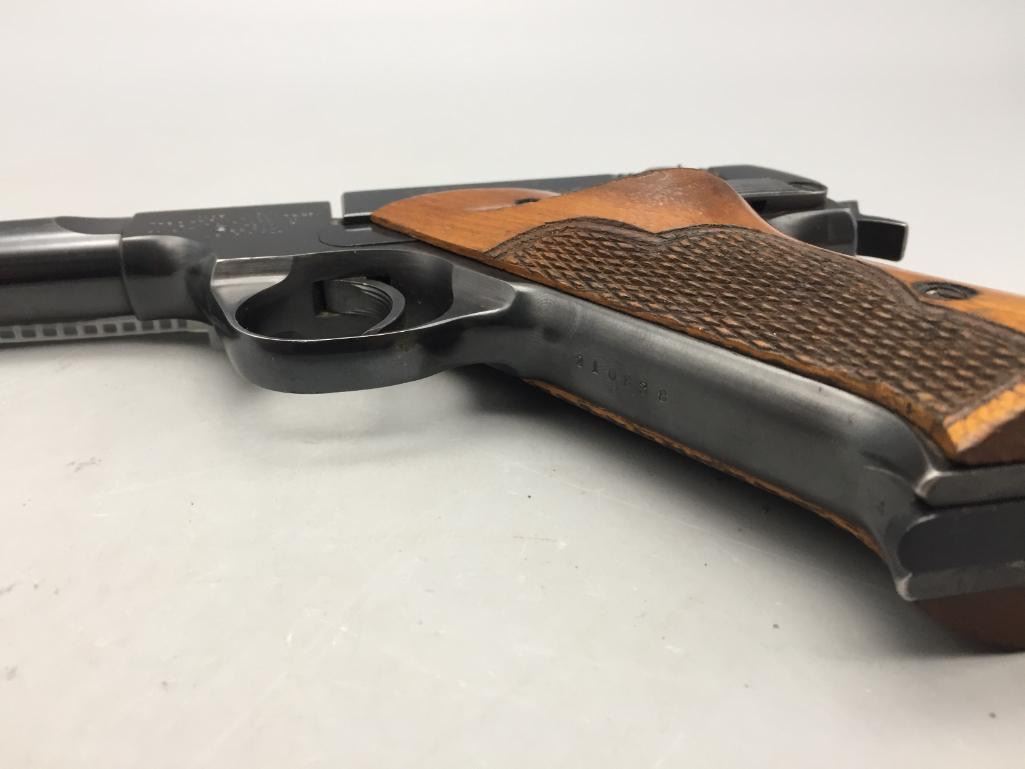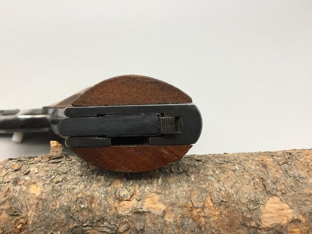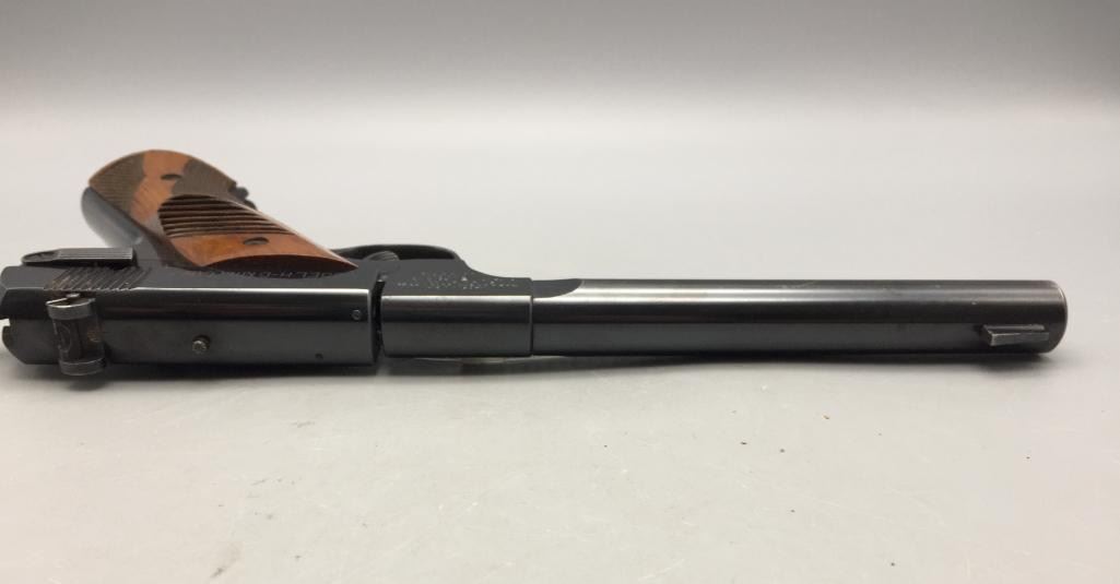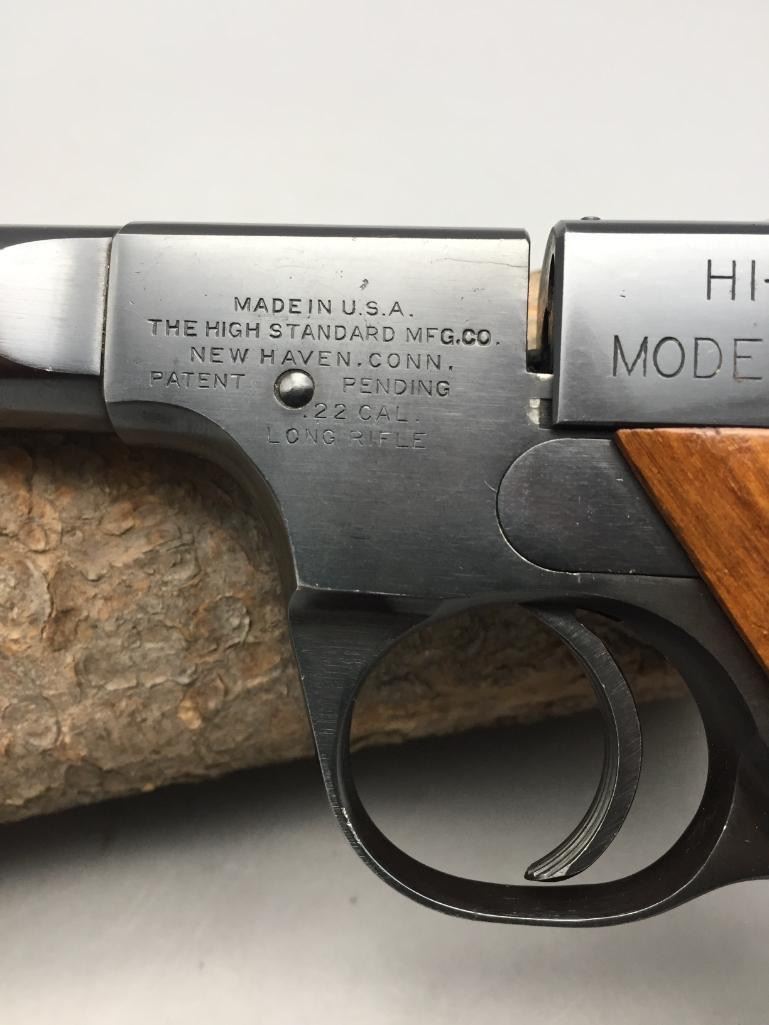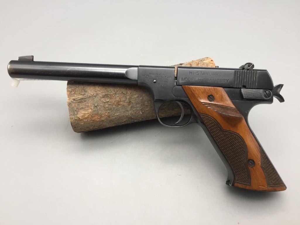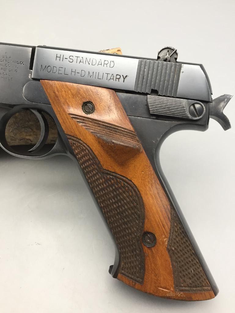 For your bidding pleasure we offer for sale this High Standard H-D military model in .22 long rifle caliber. It features checkered walnut grips and a 6-3/4" barrel. It is in very nice condition for its age. It will come with the pistol case pictured. Maker: High Standard. Serial No. 210838. Size: Barrel measures 6-3/4". Age: Circa 1947. Please look closely at the pictures - they are an important part of our description. Shipping: There will be a $15 handling / packaging fee for shipping this lot. The actual cost of postage will be added on top of that. *****This firearm requires an FFL Transfer*****