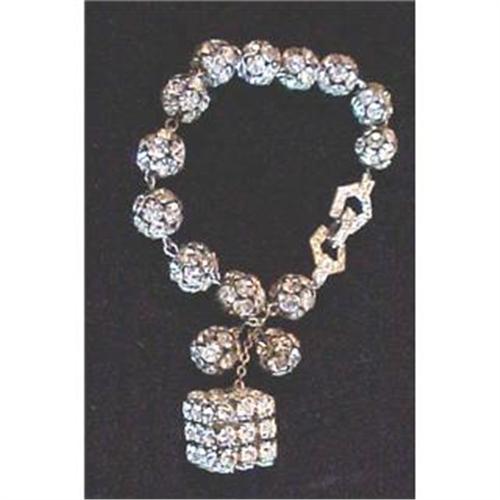 This is a charming vintage rhinestone bracelet made up of rhinestone rondelles linked to each other for 7". There is a rhinestone buckle clasp and a dangle rhinestone encrusted cube and a pair of balls that also dangle 1 1/2". One rhinestone has green clouding. The rest of the bracelet is bright and sparkles.