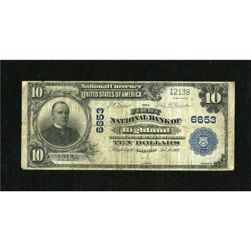 <B>Highland, IL</B></I> - $10 1902 Plain Back Fr. 624 <B>The First NB</B></I> Ch. # 6653<BR>Solid paper and claims to a full Fine will add to the bidding action on this piece. <B>Very Good-Fine.</B></I><BR><I>From The Lincoln Collection</B></I><BR><BR><b>Shipping:</b> Coins & Currency (<a target="_blank" href="http://www.heritageauctions.com/common/shipping.php">view shipping information</a>)