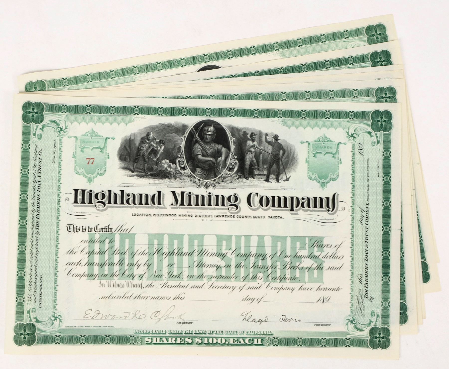 Lot of 6 stocks, unissued but signed by Lloyd Tevis as president and Edward Clark as secretary. Signatures clean. "Location, Whitewood Mining District, Lawrence County, South Dakota." This was one of the companies, along with the famous Homestake Mine, operated by George Hearst, JB Haggin, and Tevis. Tevis also once served as president for Wells Fargo.