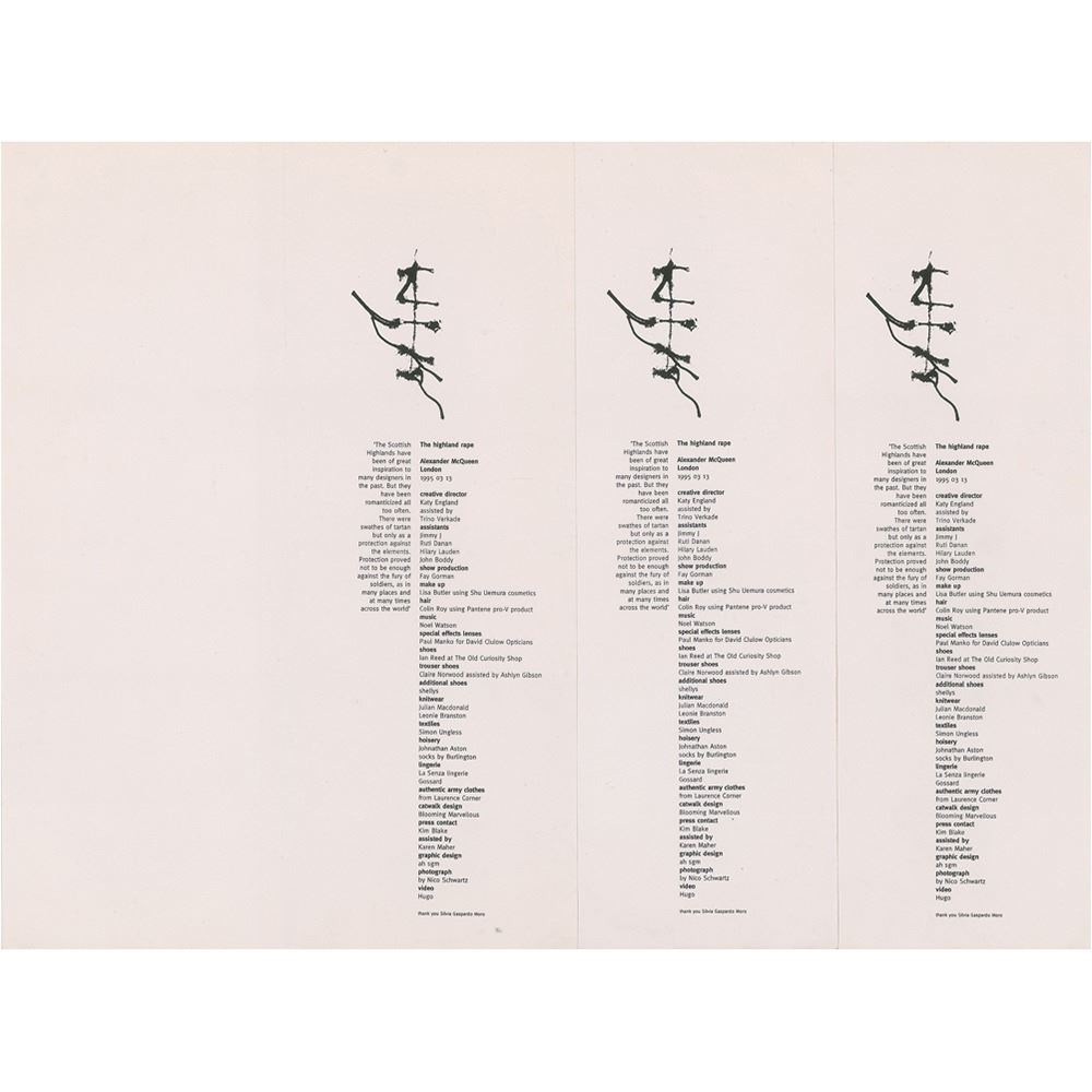 Group of three reverse sides of an invitation for the Alexander McQueen fashion show, 'Highland Rape,' staged in the British Fashion Council tent on the east lawn of the Natural History Museum on March 3, 1995, as part of the designer’s controversial Autumn/Winter 1995 collection. The invitation, which measures 8.25? x 11.75?, features a credit list for the production, with an upper image of stitches on skin, a dedication to designer Silvia Gaspardo Moro, and a quote to left side: “The Scottish Highlands have been of great inspiration to many designers in the past. But they have been romanticized all too often. There were swathes of tartan but only as a protection against the elements. Protection proved not to be enough against the fury of soldiers, as in many places and at many times across the world.” In overall fine condition, with central folds and light creasing.
