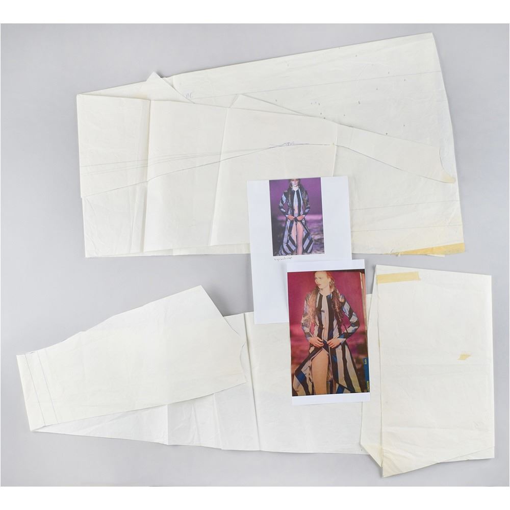 A pattern composed of darts which would contour the back and join a single panel in the center back. This coat appeared in a sold color and a striped version on the runway. The pattern features fascinating arrangements of dot marks which denote the point where stitches would pull and gather the hem for a pouf affect to create volume.
