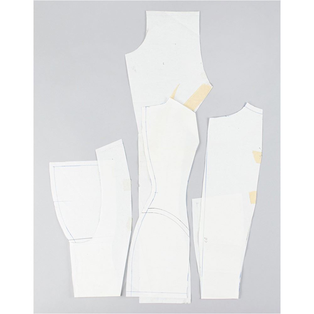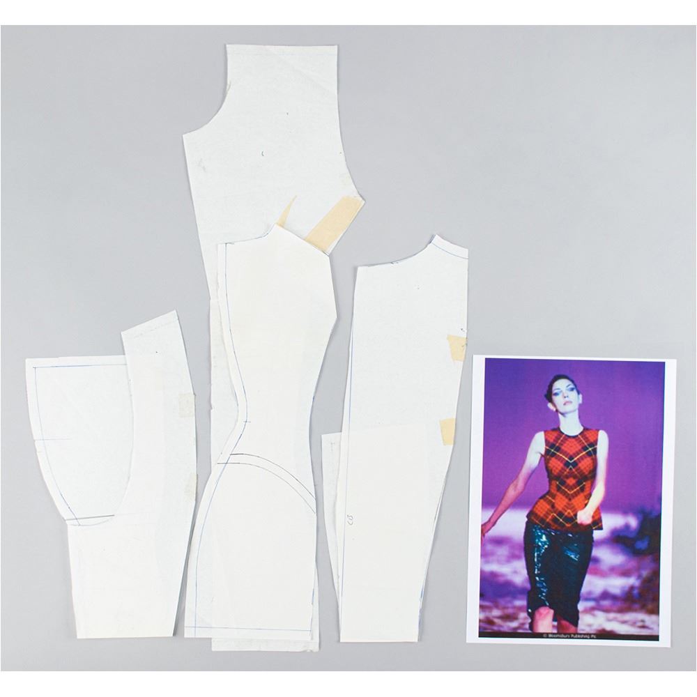 Three-piece original McQueen studio pattern for a padded hip corseted top from the show, each portion measuring approximately 24 inches in length. Shoulder pads were used to build out the hip and the pattern features lines to mark where they would be placed. This top was made in wool MacQueen tartan. This has handwriting by Lee McQueen present on the pattern.