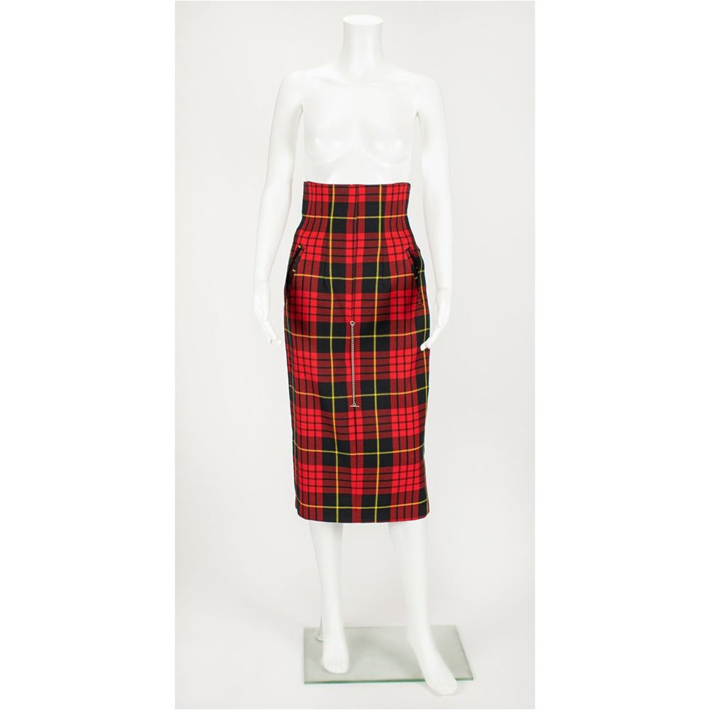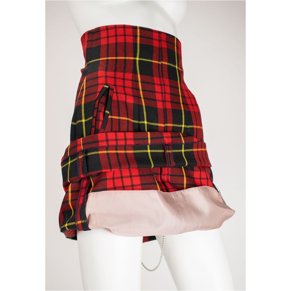 A calf-length wool MacQueen tartan skirt with contoured slash pockets and rear zip. The skirt is punctured with a silver watch fob to contour its silhouette and allow skirt to fit like a trouser when the chain goes between the legs and pulls the seat of the skirt firm against the buttocks. The silver chain was made by jeweler and McQueen's friend Shaun Leane specifically for this collection. This appeared on the catwalk and is accompanied by it's original pattern. Alexander McQueen would have sketched, hand-sewn, and cut the patterns for this garment.