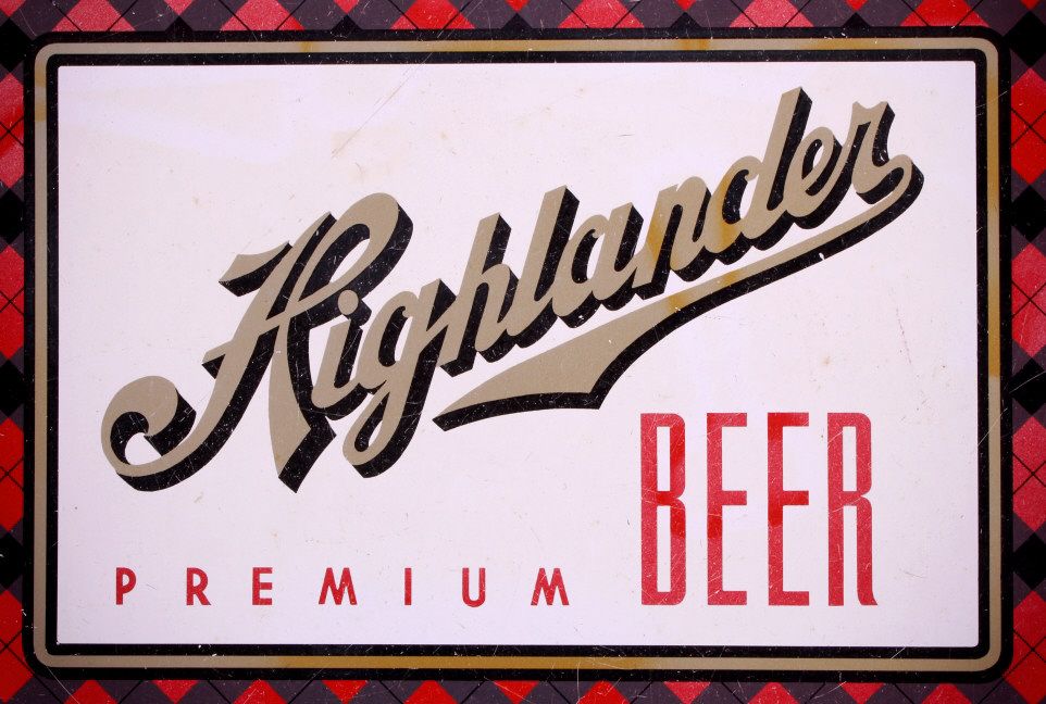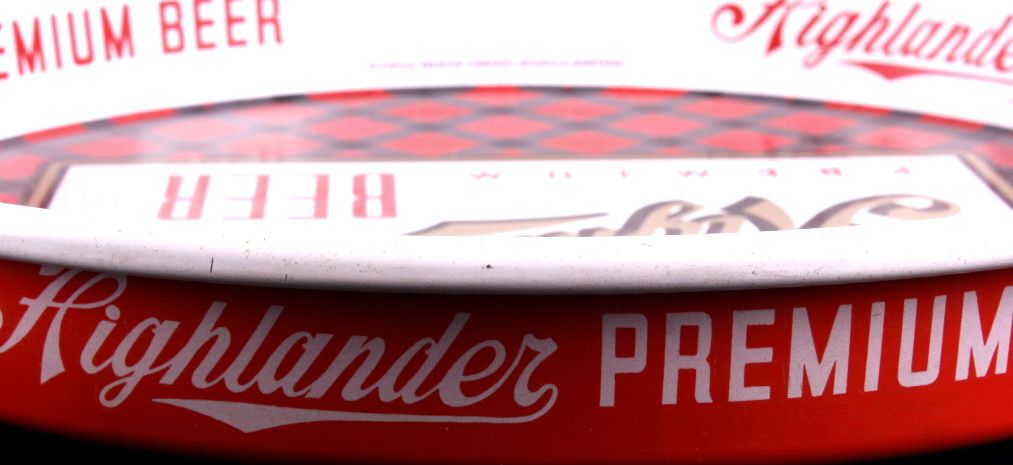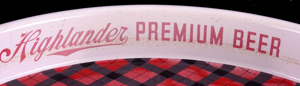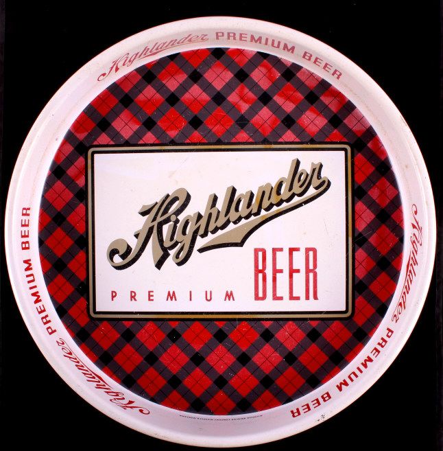 This is an original Highlander Beer tray from Missoula Montana. This tray features the Highlander logo with the plaid background. There is a slight fade to the graphics. It is in very good overall condition. The Highlander Beer tray measures 13" in diameter.