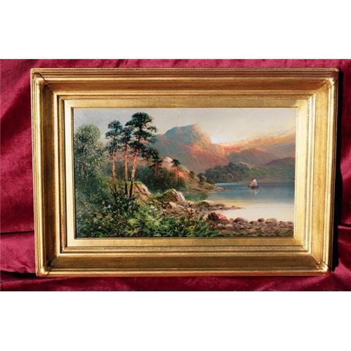 Fantastic Impressionist Masterpiece by Frank Hider (British/ b.1861, d.1933) Entitled: "Evening in the Highlands", this original antique oil is one of the most masterful and colorful you will ever see. A sureness of hand and delicacy of eye is demonstrated throughout, with great orange sky starting to hint at a darkening light with a sailboat on the lake and superb articulated foreground grasses with a well chosen gilt wide frame with ribboned corners...This is a great painting in mint condition, signed "F. Hider" (L/L) and titled verso. Lots of color with creams,blues,greens,rust, and grays, professionally cleaned in museum grade surface. Amazing piece! Thanks for looking, Chas.