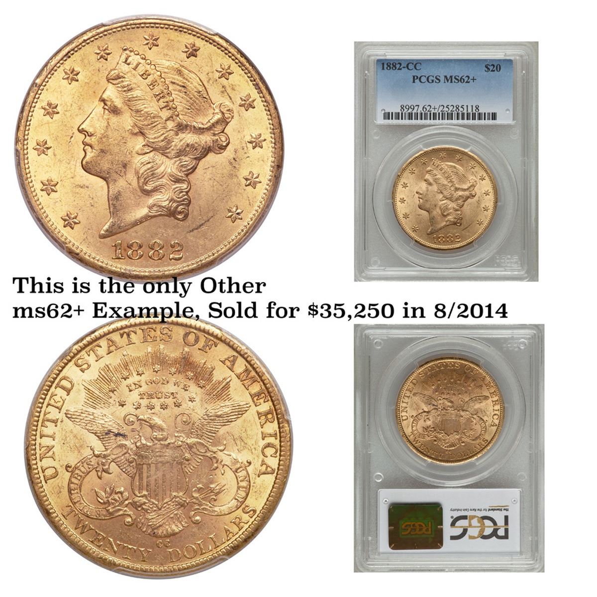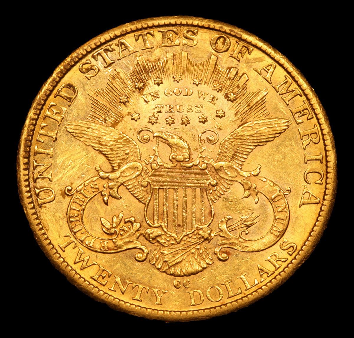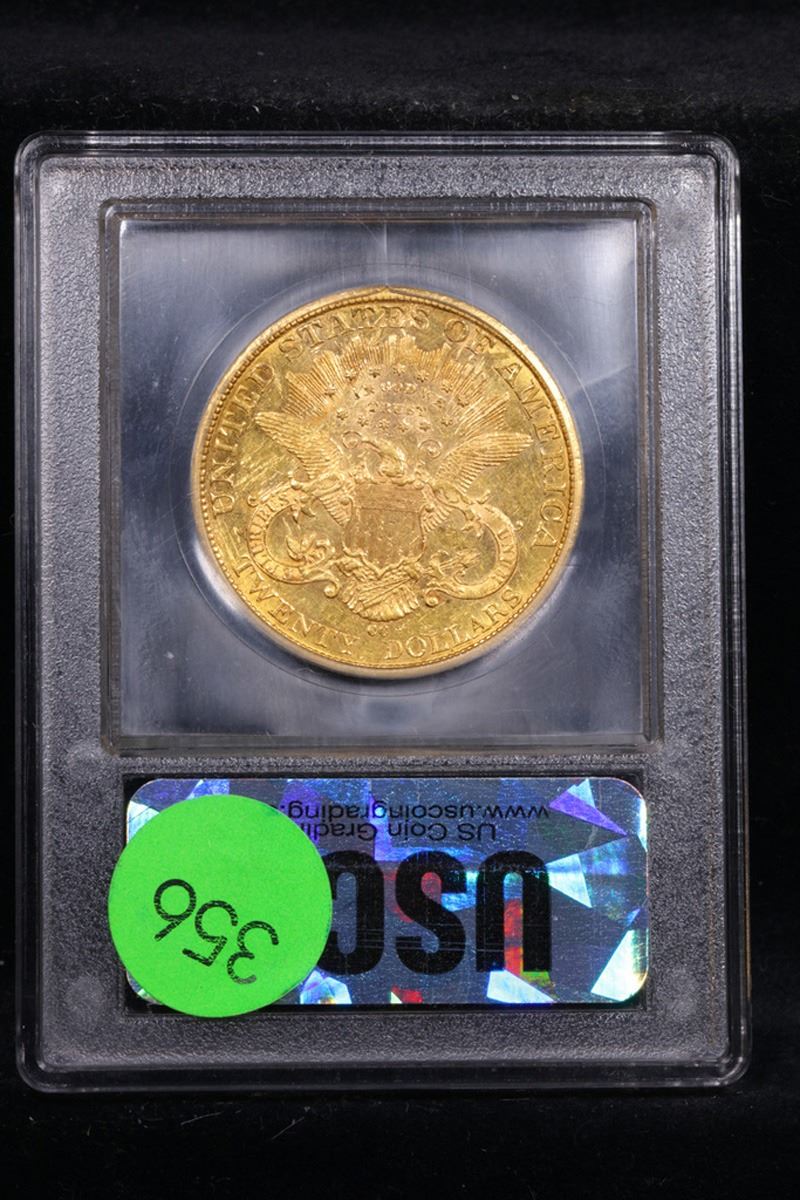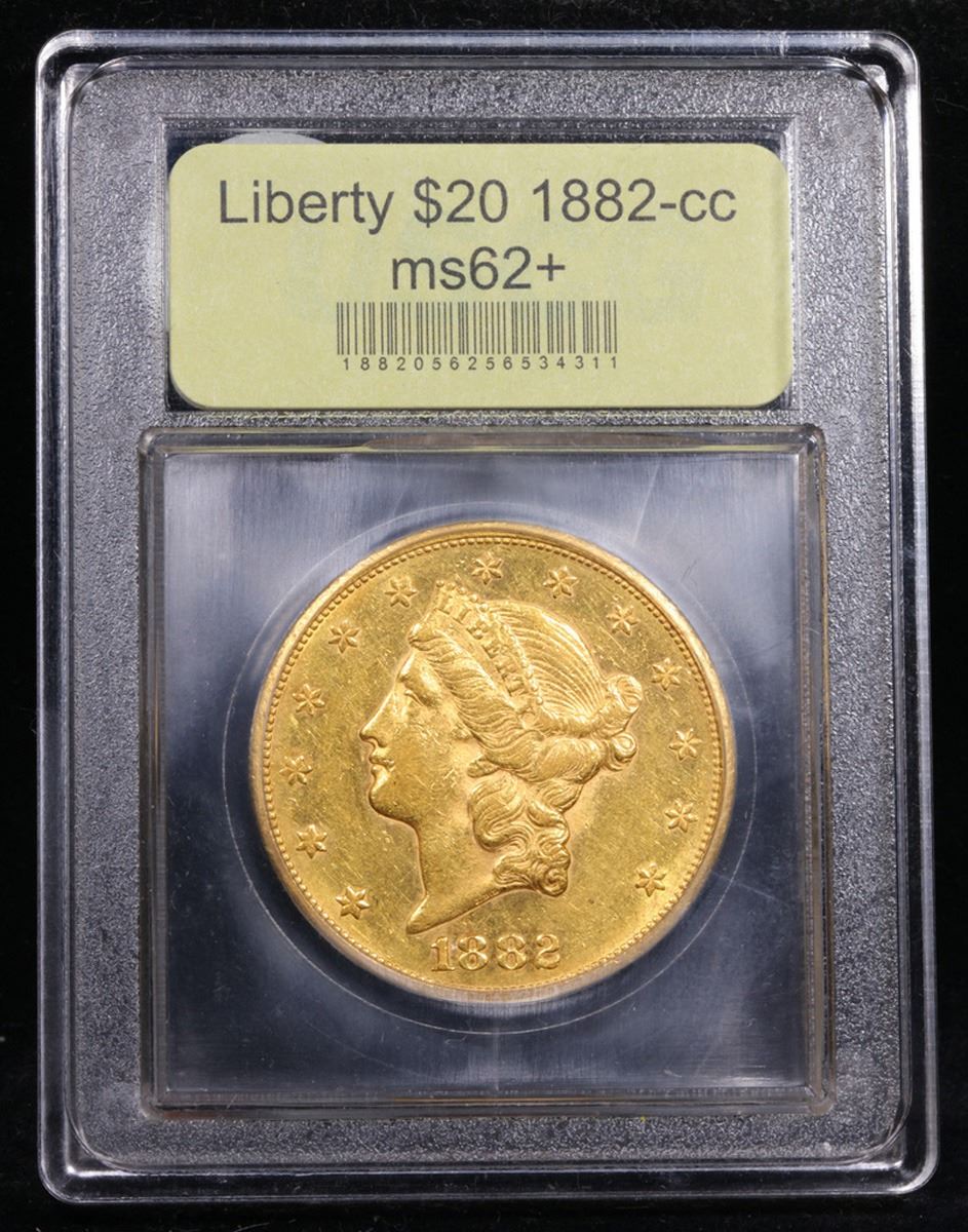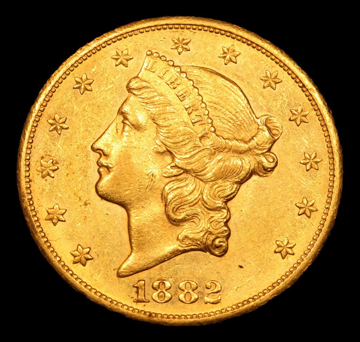 ***Auction Highlight*** 1882-cc Gold Liberty Double Eagle $20 Graded Select Unc By USCG. Up for Auction is an Impressive 1882-CC Double Eagle, Seldom Offered in Mint State. This lovely example combines a richly frosted obverse with a modestly semi-proof like reverse. Both sides are bathed in handsome deep honey-rose patina that provides an attractively original appearance. Sharply struck throughout with great eye appeal. Only 39,140 double eagles were struck at the Carson City Mint in 1882 ($782,800 face value). Most of these circulated extensively on the West Coast, although others were shipped overseas and found their way into European bank hoards. Q. David Bowers estimated an Uncirculated population of 70 to 100 examples when he wrote his Guide Book to Double Eagles for Whitman in 2004. His estimate has stood the test of time. It is believed that many, and perhaps most of the high grade examples presently known have been imported from Europe in recent decades. Population reports are laden with resubmissions that do not represent different coins. What population reports do confirm without a doubt is that this lovely Mint State example ranks among the finest 1882-CC double eagles available to today's discerning numismatists. Tied for 4th Finest known. With NONE ever graded higher than ms63. To note the recent auction results, the two ms63 sold in 2012 and 2005 for $80,000 and $69,000. The Other ms62+ sold in 2014 for $37,500. I have included a photo of this coin for your comparison. I think ours is nicer. I will further note that the last 9 sales of ms62 examples were $31,725 in 2019, $29,375 in 2014, $30,550 in 2014, $26,450 in 2012, $22,425 in 2011, $25,202 in 2018, $30,814 in 2014, $21,275 in 2010 & $28,750 in 2006. I would anticipate vigorous bidding and wish you all good luck. A Corey's Pick, Bid to Win, Don't let it get Away, you might not find its equal Coin. I give this coin my highest recommendation