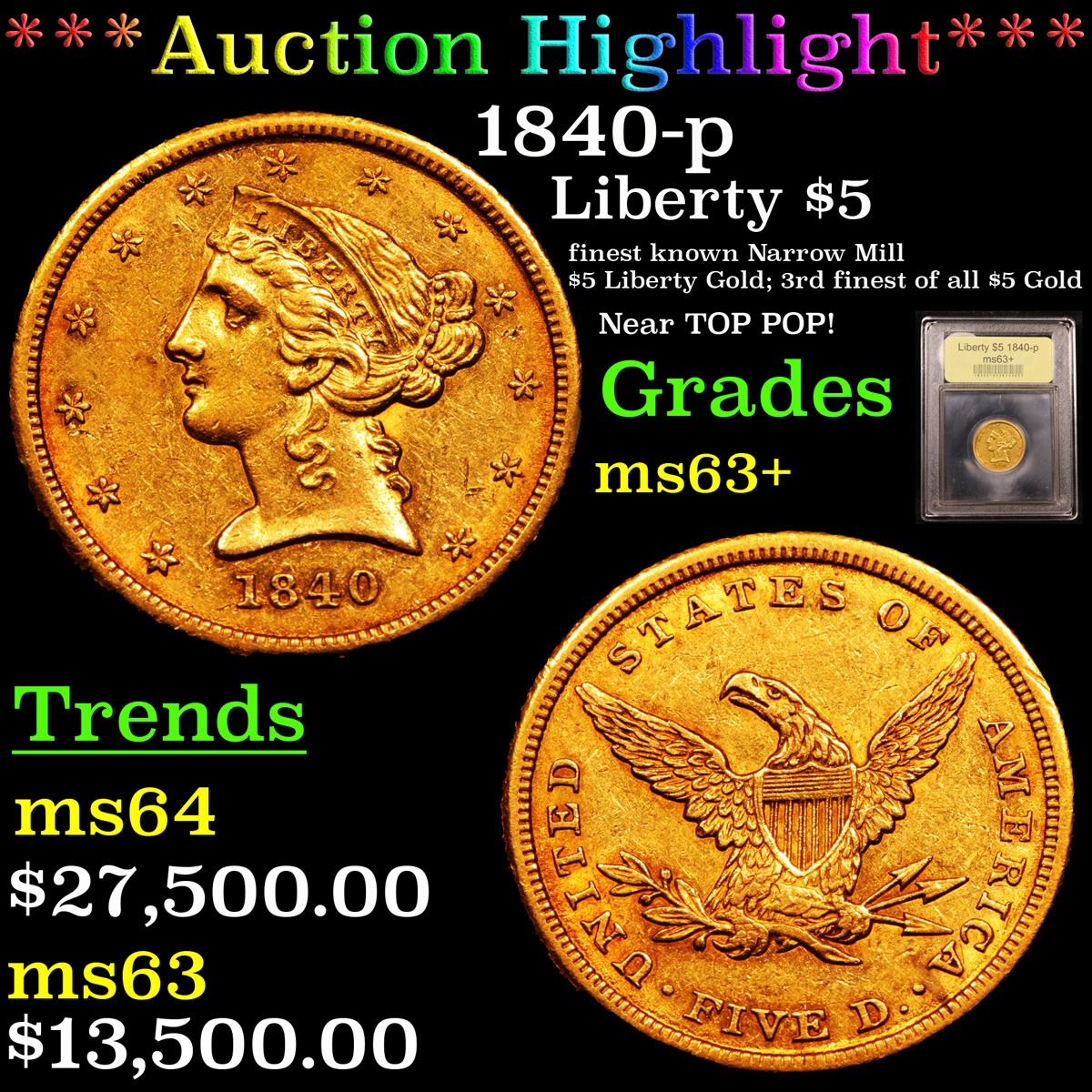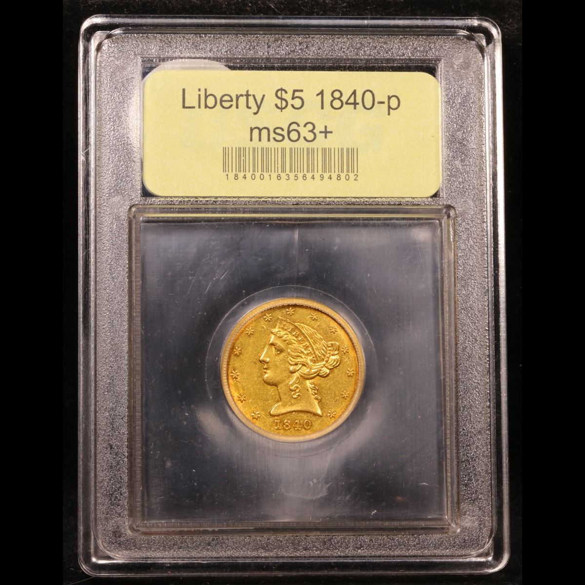 ***Auction Highlight*** 1840-p Gold Liberty Half Eagle $5 Graded Select+ Unc By USCG. Highlight of the Entire Auction. Up for Auction is the finest known Narrow Mill $5 Liberty Gold, and a coin holding the lone spot as 3rd finest known of all $5 gold Liberty half Eagles. During 1840, the diameter of the $5 gold was reduced from 22.5mm to 21.6mm. The newly reduced diameter remained standard for the rest of the half eagle series through 1929. The Philadelphia Mint produced 137,382 half eagles during the year, although the distribution between the two varieties is not specifically known experts believe that 70% were the road mill while only 30% were the narrow mill. The two finest known examples of the 1840-p $5 Liberty gold are both Broad mill, thus making this coin the finest known narrow mill variety, and 3rd finest known overall. I wish you good luck in obtaining this terrific coin. A Corey's Pick, Bid to Win, Don't let it get Away, you might not find its equal Coin. I give this coin my highest recommendation