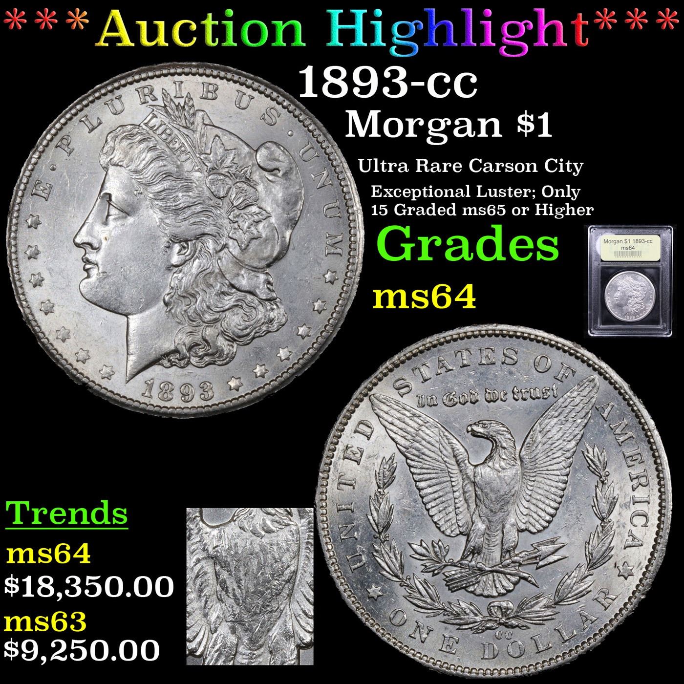***Auction Highlight*** 1893-cc Morgan Dollar $1 Graded Choice Unc By USCG. The three most important CC Morgan silver dollars are the key-date 1889-CC, the scarce 1879-CC, and the equally scarce and highly important 1893-CC. The 1893-CC was the final Morgan silver dollar issue from the Carson City Mint before that facility permanently ceased coinage operations. This fully brilliant, frosty, and untoned silver example has exceptional luster. The obverse has scattered, inconsequential marks, while the reverse is finer, as usual for the issue. Only 15 examples have ever graded 65 or higher. This is an important example, of a scarce issue.. A Corey's Pick, Bid to Win, Don't let it get Away, you might not find its equal Coin. I give this coin my highest recommendation