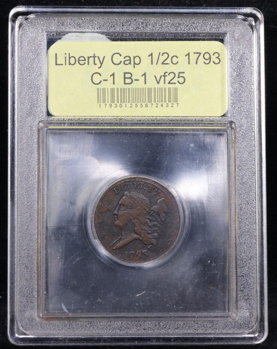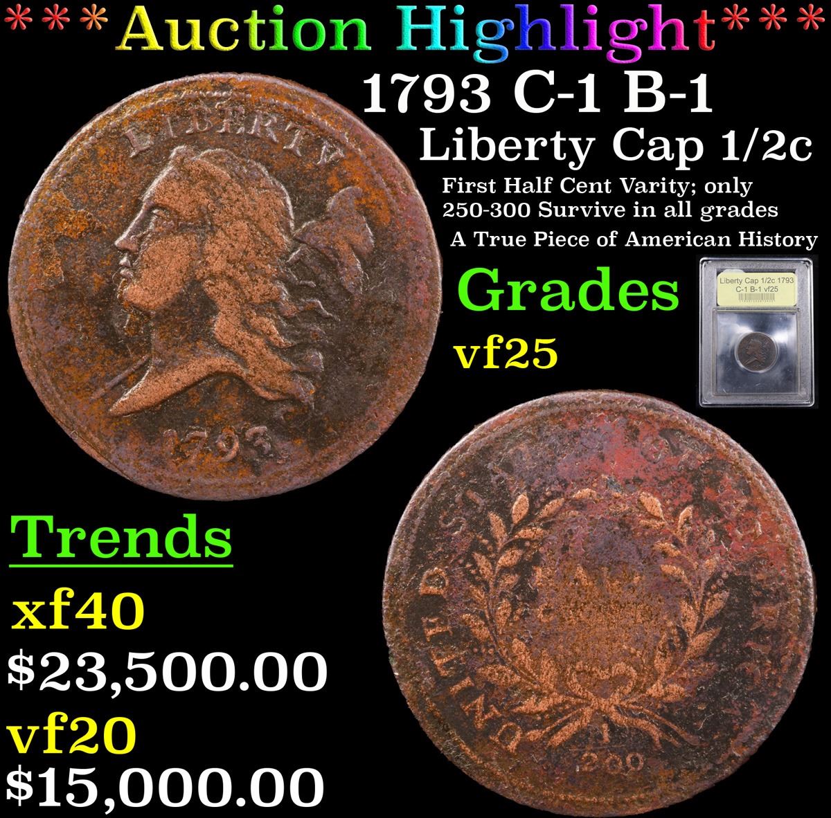 ***Auction Highlight*** 1793 C-1 B-1 Liberty Cap half cent 1/2c Graded vf+ By USCG. Highlight of the entire Auction - The First Half Cent Variety The Cohen-1 die pair is identified as the first half cent variety struck at the Philadelphia Mint in July 1793. An extremely important historical issue with a survival estimated at 250 to 300 pieces in all grades. The total mintage for 1793 half cents was 36,103 coins, and each of the four varieties are nearly equal in rarity, with Cohen-1 slightly scarcer than the other three varieties. This piece combines olive and chocolate-brown patina with slight surface roughness on both sides, but without large marks or other imperfections. The strike is nicely but not perfectly centered. An Outstanding addition to the finest collection, and a piece of American History. Trends vf20 $15,000, xf40 $23,500 A Corey's Pick, Bid to Win, Don't let it get Away, you might not find its equal Coin. I give this coin my highest recommendation
