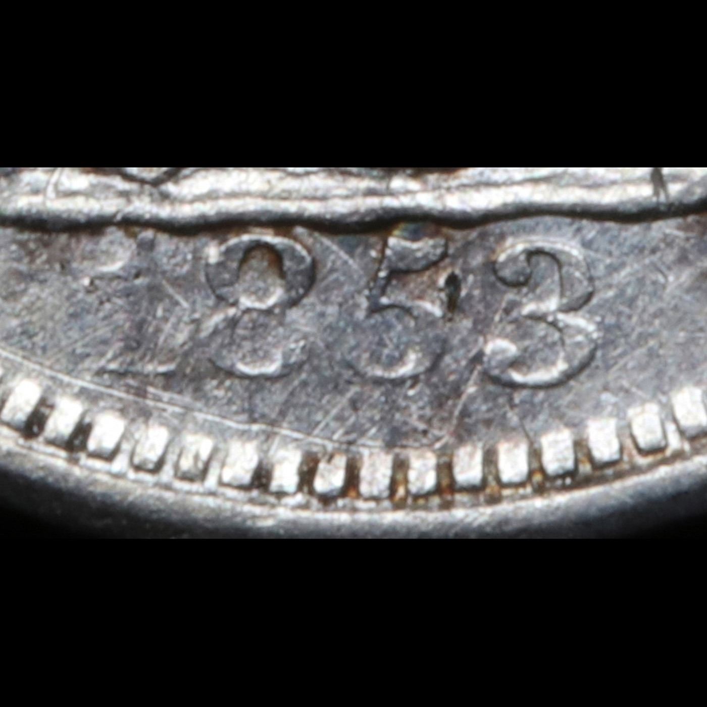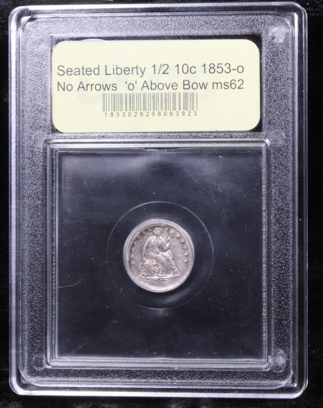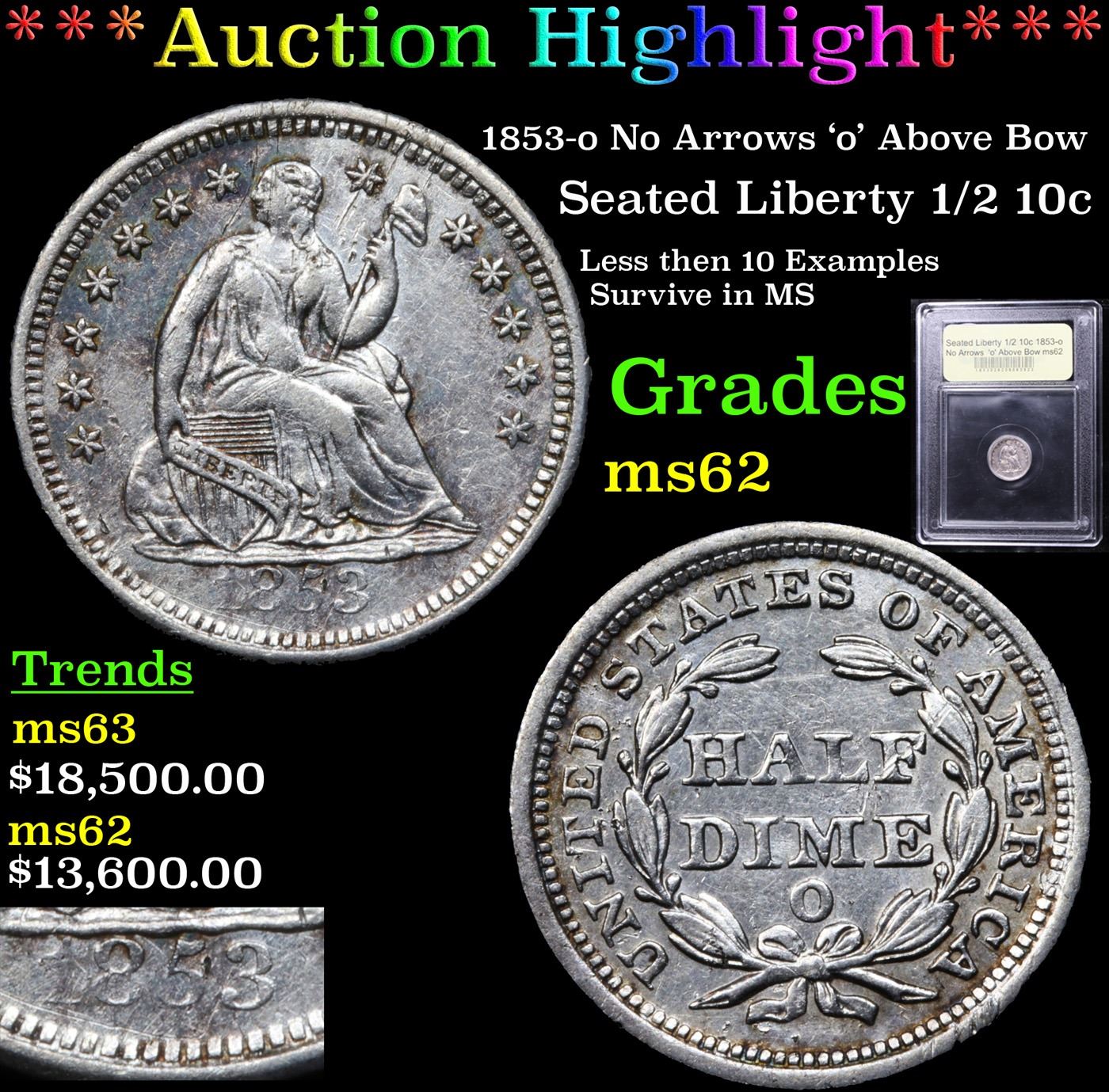 ***Auction Highlight*** 1853-o No Arrows 'o' Above Bow Seated Liberty Half Dime 1/2 10c Graded Select Unc BY USCG. HIGHLIGHT OF THE ENTIRE AUCTION. Half dime specialists will be excited to see this piece appear at auction. The opportunity to bid on any Mint State example of this date seldom occurs. NGC and PCGS have only certified 10 Mint State submissions of the issue, including resubmissions. Probably only three or four Mint State examples survive, including this piece, the Pittman specimen, the Eliasberg coin, and one or two others.This piece exhibits nice luster and some light toning. The strike is bold, and even the bottom part of the date is fully visible.The port city of New Orleans had an unceasing need for coinage in the years leading up to the Civil War, and as a rule, the pieces produced there circulated rather than sitting in vaults. This makes a number of silver issues, particularly those struck before the weight adjustment of 1853, rarities in Mint State. The 1853-O No Arrows, the last of those issues, is among the most elusive, its mintage of 160,000 pieces having experienced considerable attrition. The present coin is a distinctly high-end survivor even taking the few grade limiting marks on the obverse into account. The coin at hand is likely one of only 5 surviving mint state examples. WOW. I wish you good luck in owning one of these surviving mint state 1853-o No Arrows Half Dimes. A Corey's Pick, Bid to Win, Don't let it get Away, you might not find its equal Coin. I give this coin my highest recommendation
