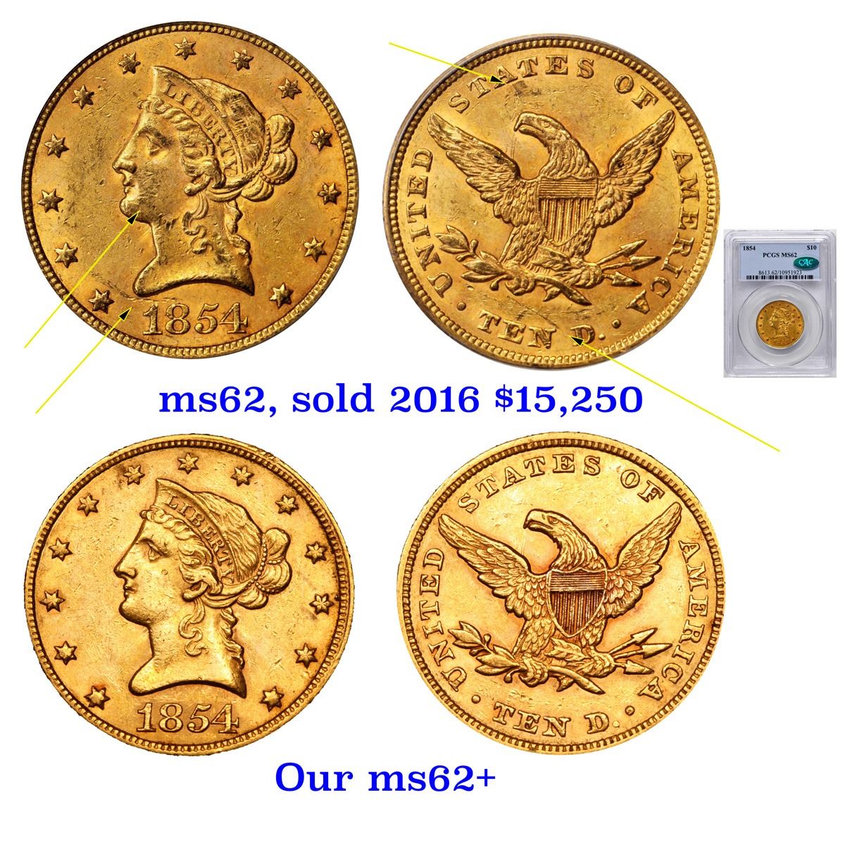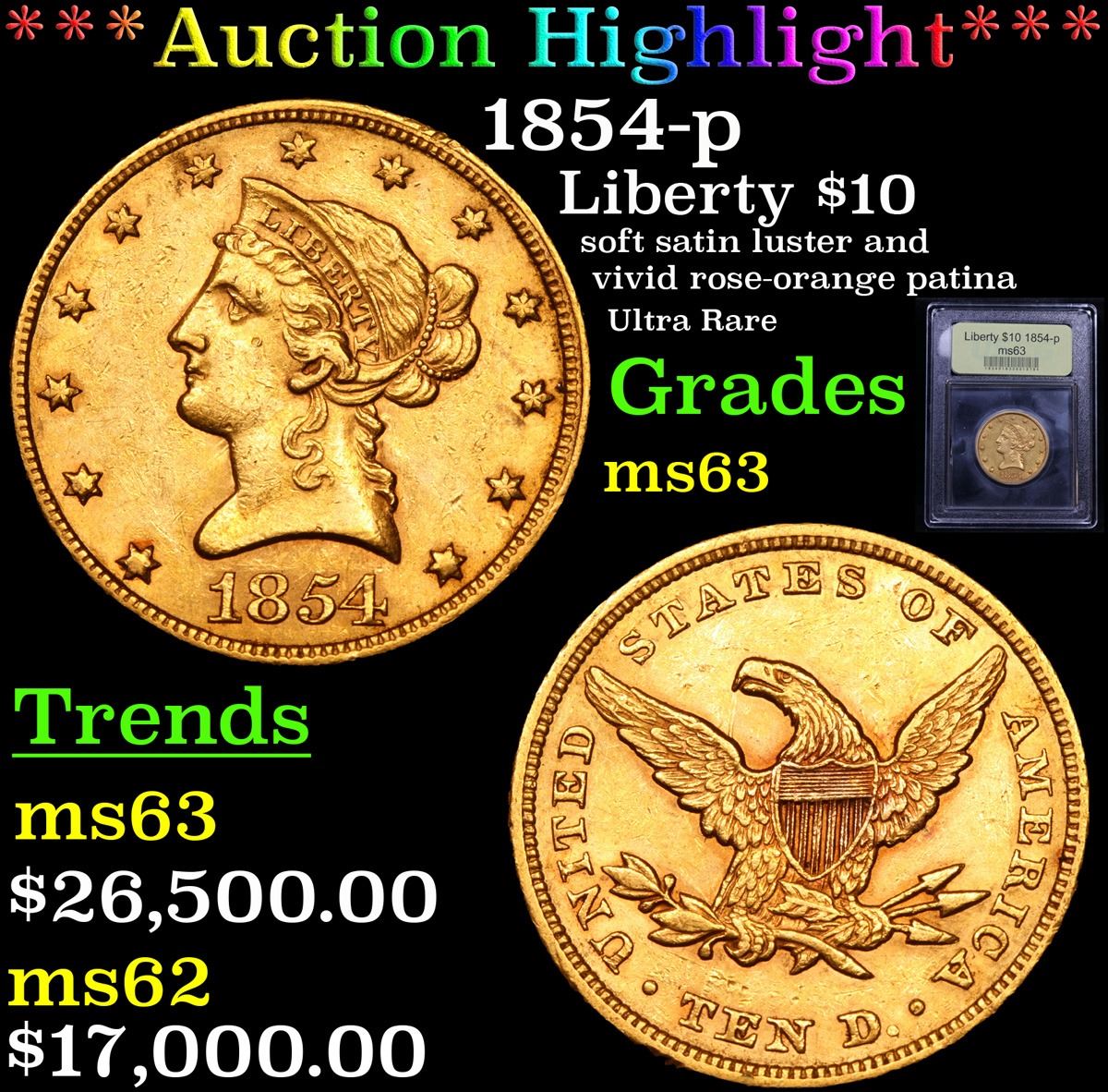 ***Auction Highlight*** 1854-p Gold Liberty Eagle $10 Graded Select Unc By USCG. Up for Auction is an Exceedingly Rare Mint State 1854 Liberty $10 Gold Eagle. Both sides of this delightful 1854 Liberty eagle display a lovely blend of soft satin luster and vivid rose-orange patina. Overall boldly defined and very attractive at the assigned grade level. Even at an early date the 1854 eagle was regarded as scarce. An example is provided by lot 1265 in the Dr. James R. Chilton Collection sold by Bangs, Merwin, & Company in March of 1865: "1854 Good and scarce. Dickeson, page 172." The Dickeson reference is to the American Numismatic Manual, the most impressive work on American rare coins produced up to that point in time. In the years to follow, 1854 eagles appeared at auction now and then, never with frequency, as large denomination circulation strikes were not particularly popular with numismatists of earlier generations. Among those that were offered, nearly all were in lower circulated grades, generally what we would classify as VF or EF by today's standards. Exceptions are few and far between, one being lot 126 in the J.C. Morgenthau & Company sale of June 1940, simply described as "1854 Uncirculated." Fast forward to August 1980 when David W. Akers described lot 953 in Paramount's session of Auction '80, a coin listed as MS-63, with the comment, still appropriate today: "...the 1854 is actually extremely rare in this grade. Only 54,250 were minted, we doubt if more than six to eight Mint State examples exist." This is certainly one of the very few Uncirculated survivors to ever be brought to any auction, and it is a coin that is sure to see spirited bidding among astute collectors. I estimate that it s the 2nd or 3rd finest known, and the finest to ever come to auction in the last 20 years. I have included a picture of an ms62 PCGS example for your comparison. It sold in 2016 for $15,275. I believe ours is superior.