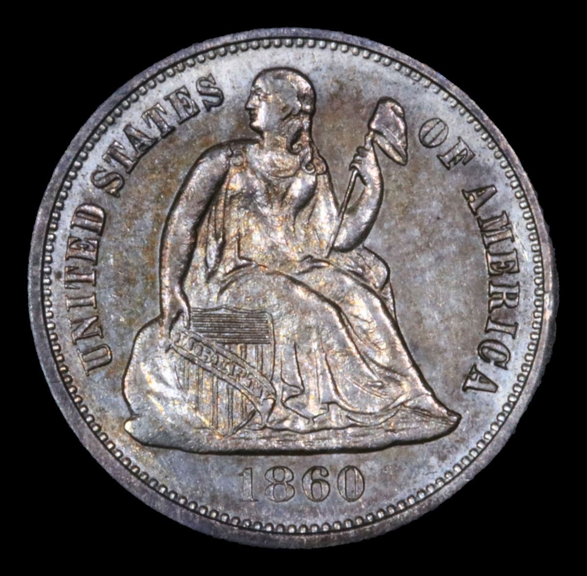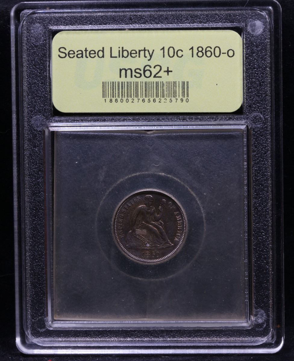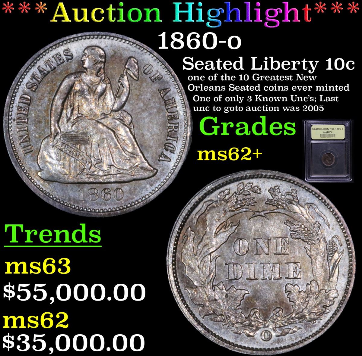 ***Auction Highlight*** 1860-o Seated Liberty Dime 10c Graded Select Unc By USCG. Up for Auction is a Numismatic Rarity and one of the 10 Greatest New Orleans Seated coins ever minted. The Legendary 1860-o Seated Liberty Dime. To Quote Ron Guth of PCGS “In a survey of the members of the Liberty Seated Collectors Club, published in the March 2008 issue of the Gerecht Journal, the 1860-O Dime was ranked second among the Ten Greatest New Orleans Seated Coins: "This is the rarest New Orleans dime with a mintage of 40,000 pieces and examples are very rare in mint state. The finest known example is the Lovejoy specimen that has been graded NGC MS-67. This coin was sold by Stack's for $50,000 in the Lovejoy sale in October 1990. Another mint state example is the Eliasberg specimen that has been graded MS-64. This piece brought $44,850 when it appeared in the DLRC auction of the Richmond Collection in March 2005. While only 18% of the respondents placed this issue among their top two choices, it received strong support from the majority of members with 52% placing it among their top five coins." WOW! The coin at hand is graded ms62+, and I see no evidence of any wear, or rub.. Beautifully toned, nice luster, great eye appeal. The coin is the finest graded at PCGS and in 3rd position against the only other 2 mint state survivors known which are in NGC holders. I wish you good luck in obtaining this unobtainable item.; ive included a picture of the ms64 example as a comparison A Corey's Pick, Bid to Win, Don't let it get Away, you might not find its equal Coin. I give this coin my highest recommendation