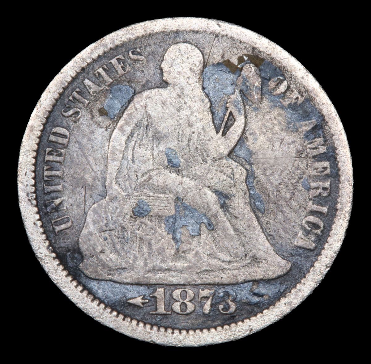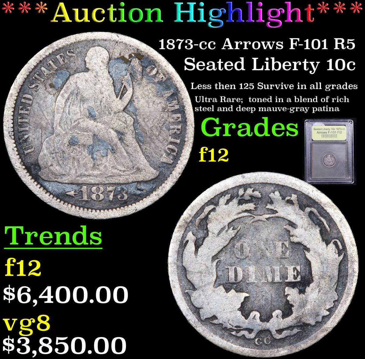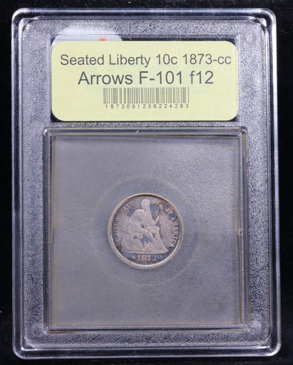 ***Auction Highlight*** 1873-cc Arrows F-101 R5 Seated Liberty Dime 10c Graded f, fine By USCG. Highlight of the Entire Auction - Up for Auction is a numismatic rarity, the Legendary 1873-CC Liberty Seated Dime. Arrows. Fortin-101, the only known dies. Rarity-5. Fine-12