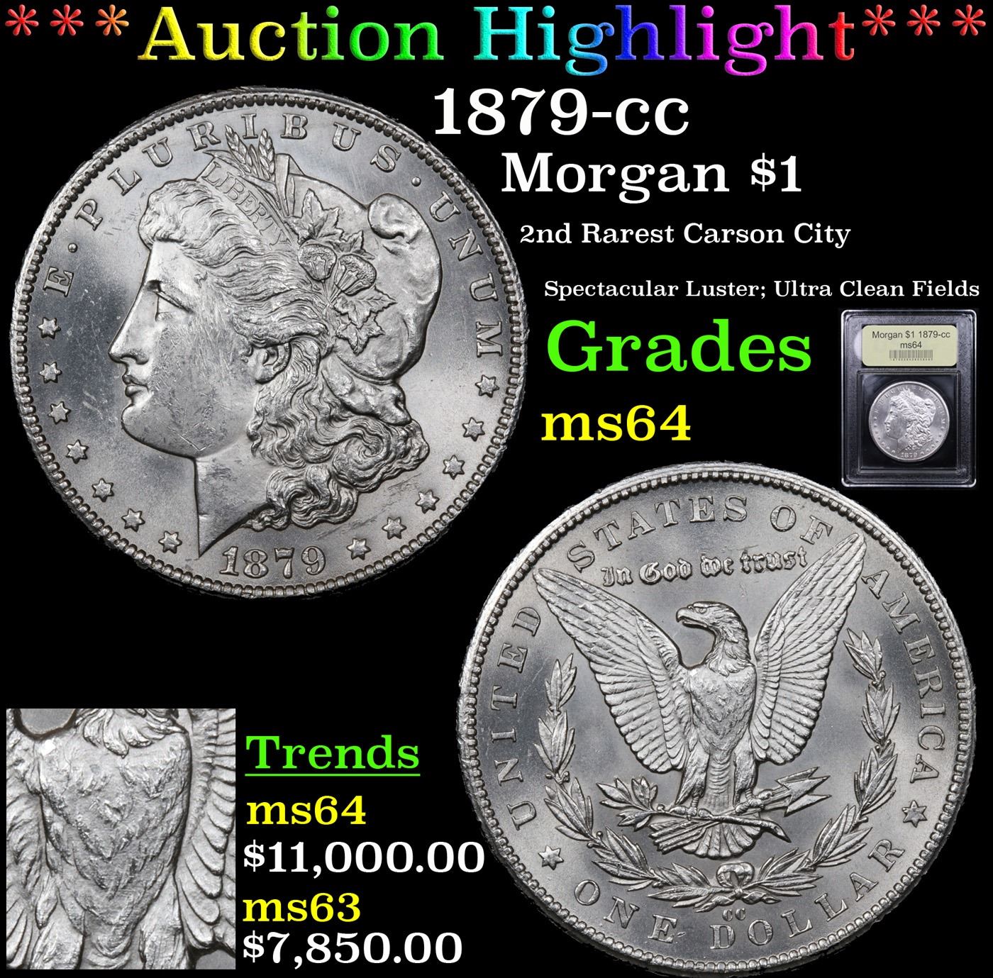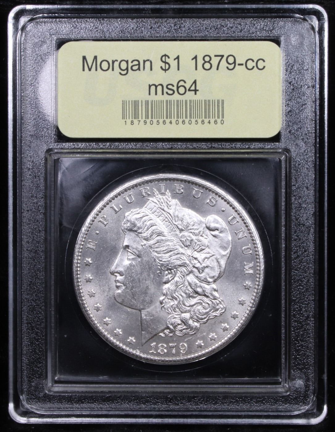 ***Auction Highlight*** 1879-cc Morgan Dollar $1 Graded Choice Unc By USCG. HIGHLIGHT OF THE ENTIRE AUCTION - Up for Auction is one of the two Keys to the Carson City Morgan Dollars, The 1879-cc. This is the “Clear cc” variety, which is in Mint State, scarcer than its capped Die Counterpart. The coin at hand has spectacular Luster and incredibly clean Fields. If the Reverse were to be Looked at alone, it would garner the solid grade of ms67 and be the single finest known. The fields of the obverse are similarly striking and rise to the level of ms66. The cheek though has grade limiting abrasions, while not distracting does limit this otherwise contender for the Single finest known example to an ms64. Brilliant Luster and Spectacularly Clean Fields dominate this untoned rarity. I wish you good Luck. A Corey's Pick, Bid to Win, Don't let it get Away, you might not find its equal Coin. I give this coin my highest recommendation