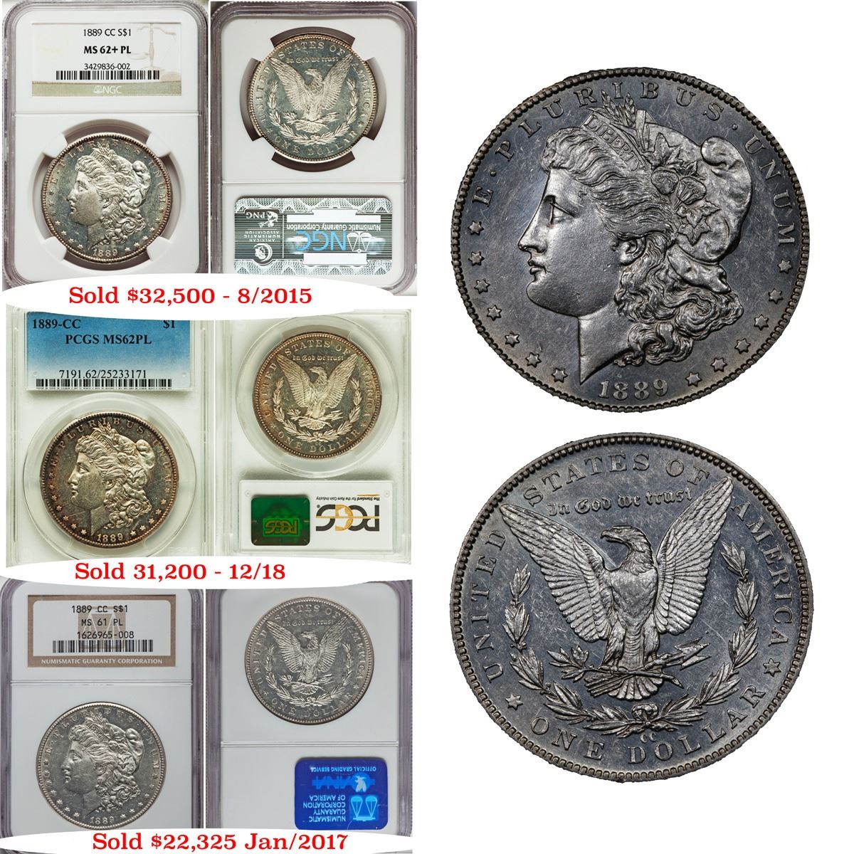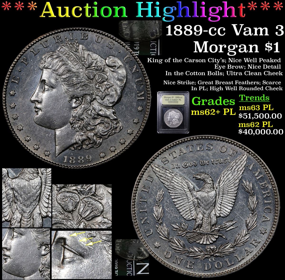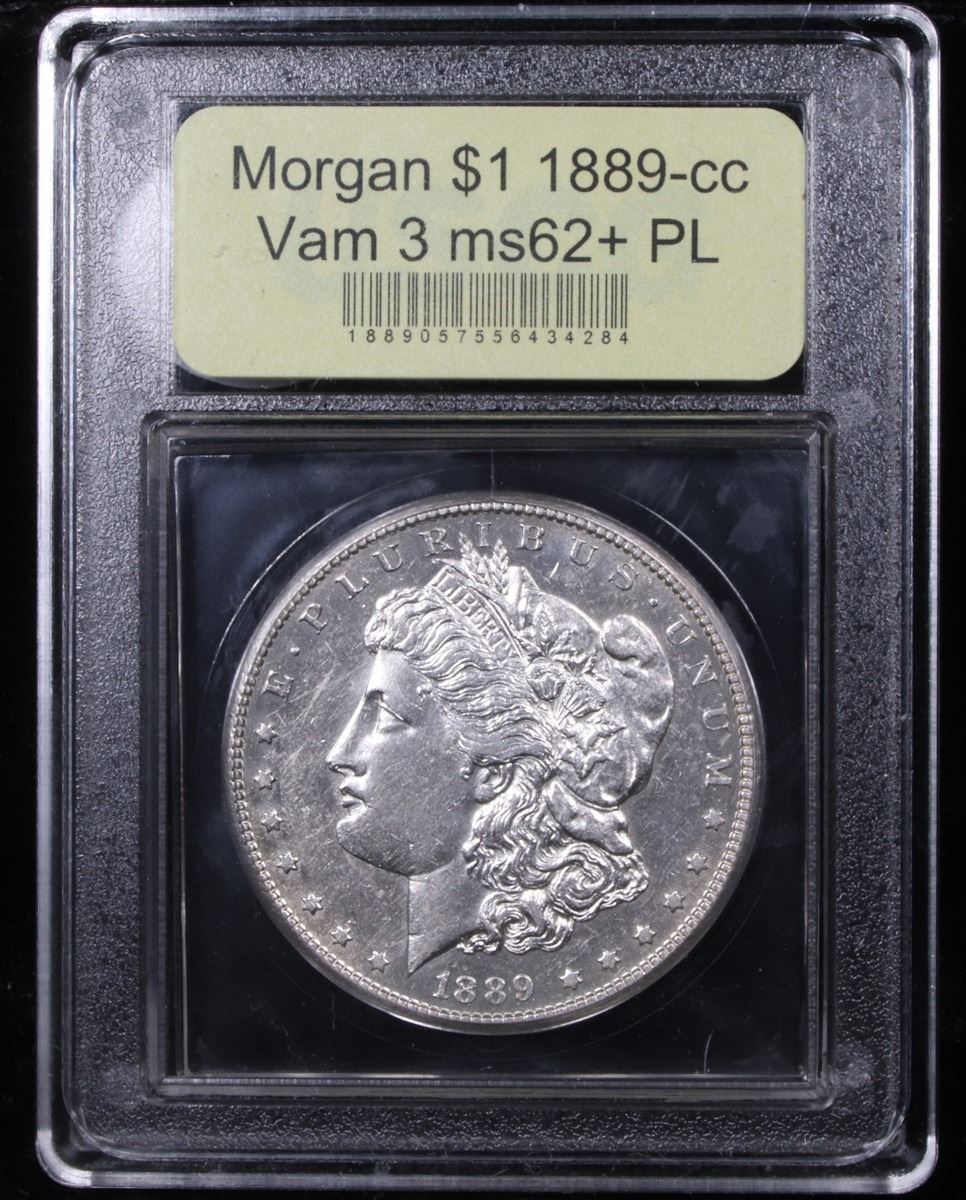 ***Auction Highlight*** 1889-cc Vam 3 Morgan Dollar $1 Graded Select Unc+ PL By USCG. Key Date 1889-CC Morgan Dollar Rare Proof like Mint State 1889-CC Morgan Silver Dollar. MS-62+ PL. Offered is a wonderful and aesthetically pleasing 1889-CC, a fabled key date Morgan dollar issue. Mirrored fields are readily evident under a light and the strike is sharp over all design elements. Very attractive for the assigned grade, this premium quality example is sure to see spirited bidding among advanced collectors. The 1889-CC is the rarest Carson City Mint Morgan silver dollar, and not because the mintage of 350,000 pieces is the lowest in this mint marked series. In fact, both the 1881-CC and 1885-CC have lower mintages, although those issues are much more plentiful than the 1889-CC in Mint State. As with so many issues in the Morgan dollar series, it is the distribution of the coins (or lack thereof) and not the mintage that defines rarity, especially in Uncirculated condition. Given the scarcity of worn examples we believe that few 1889-CC dollars were released into circulation in or near the year of issue. Rather, virtually the entire mintage was placed into storage in federal vaults, the destination for most Morgan dollars upon striking. Limited quantities were released from government holdings from the mid 1920s to the early 1960s, mostly in the West. Only a few single coins and rolls were paid out from the Treasury Department during the 1930s and 1940s, and by the time of the GSA sales of Carson City Mint Morgan dollars during the 1970s only a single 1889-CC remained in government hands. Most of the other coins that initially went into storage -- the majority of the mintage -- were undoubtedly included among the 270,232,722 silver dollars melted under provisions of the Pittman Act of 1918. Given the long standing popularity of both the Morgan dollar series and Carson City Mint coinage among specialized collectors, the small number of Mint State 1889-CC dollars remaining is nowhere near adequate to meet demand. This is a particularly desirable survivor, fully proof like, and above average preservation relative to the assigned grade. Worthy of the strongest bids. I have included 3 coins for your comparison. An ms61 PL that sold for $22,325, an ms62 PL that realized $31,200 and an ms62+ pl that realized $32,500. Trends on the 1889-cc are ms63 pl $51,500, ms63 $47,500, ms62 PL $40,000, ms62 $33,000, ms61 PL $33,500, ms61 $23,300. Good luck in attempting to acquire this numismatic rarity.. A Corey's Pick, Bid to Win, Don't let it get Away, you might not find its equal Coin. I give this coin my highest recommendation