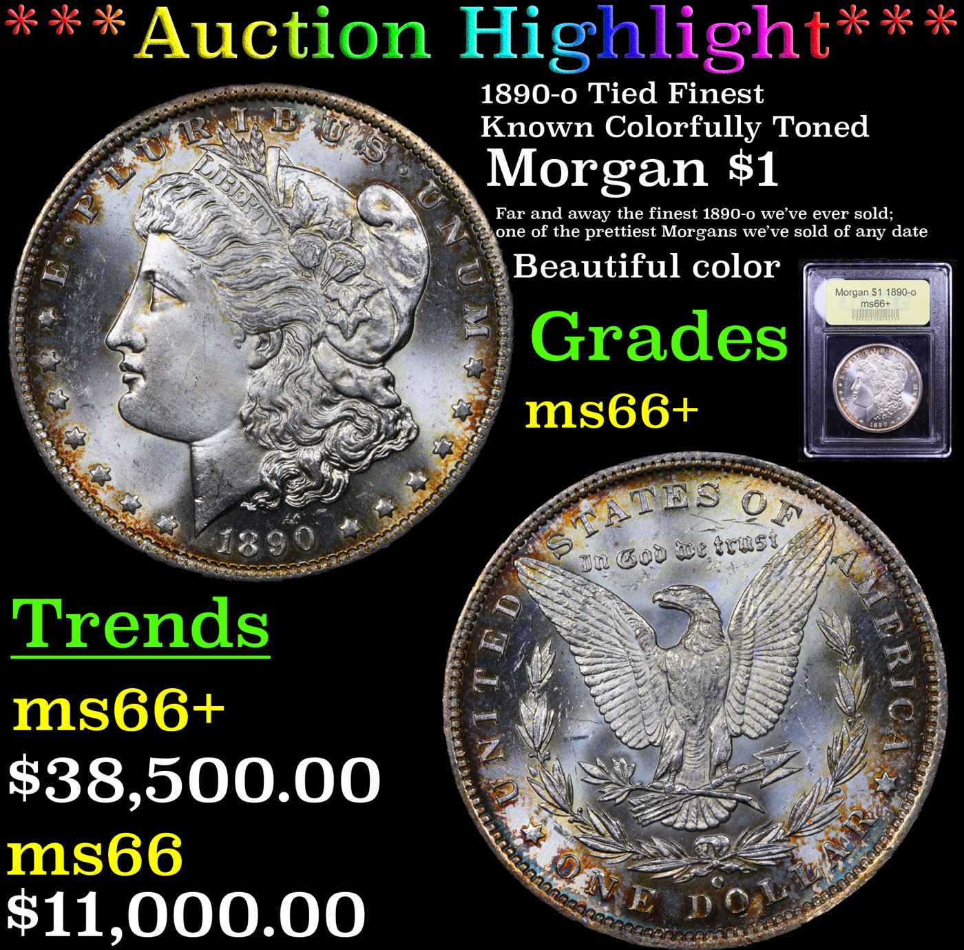 ***Auction Highlight*** 1890-o Tied Finest Known Colorfully Toned Morgan Dollar $1 Graded GEM++ Unc By USCG. HIGHLIGHT OF THE ENTIRE AUCTION. Tied For Finest Known. A richly toned Premium Gem dollar with fantastic eye appeal. Both sides are Stunning, with gold and russet hues predominating on the perimeter. Miss Liberty is Heavily Frosted and Pristine. Few abrasions are to be found, and are easy to forgive. Even if this were a commonly encountered date/mint combination at this grade level, it would still stand out. This New Orleans issue received extensive circulation, however, and pieces above the level of Gem are truly rare. Tied for finest known, and the other has never come to auction. A Corey's Pick, Bid to Win, Don't let it get Away, you might not find its equal Coin. I give this coin my highest recommendation