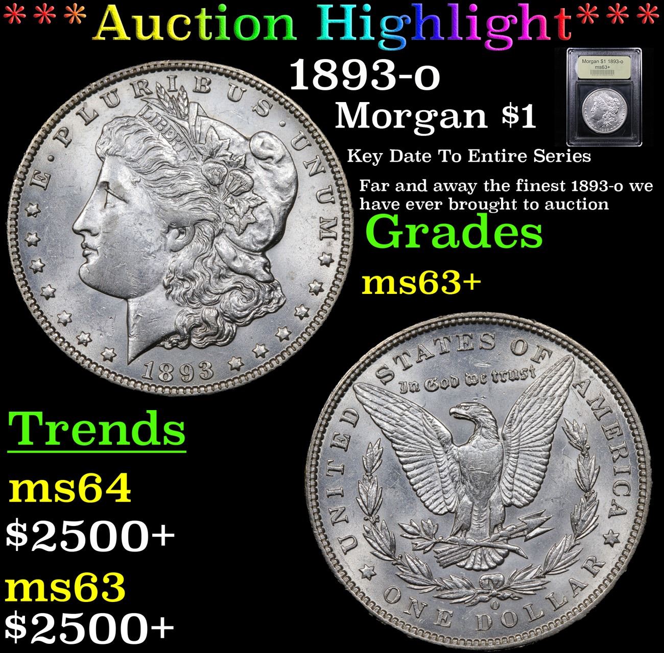 ***Auction Highlight*** 1893-o Key Date To Entire Series Far and away the finest 1893-o we have ever brought to auction Morgan Dollar $1 Graded Select+ Unc By USCG. Highlight of the Entire auction. Far and away the finest 1893-o we have ever brought to auction. This coin is a numismatic rarity in uncirculated grades. This example has strong luster, it is blast white, nice strike and vastly superior eye appeal and few bag marks. A worthy addition to any collection, perhaps even the centerpiece. Trends are ms64 $19,750 ms63 $9,350 A Corey's Pick, Bid to Win, Don't let it get Away, you might not find its equal Coin. I give this coin my highest recommendation
