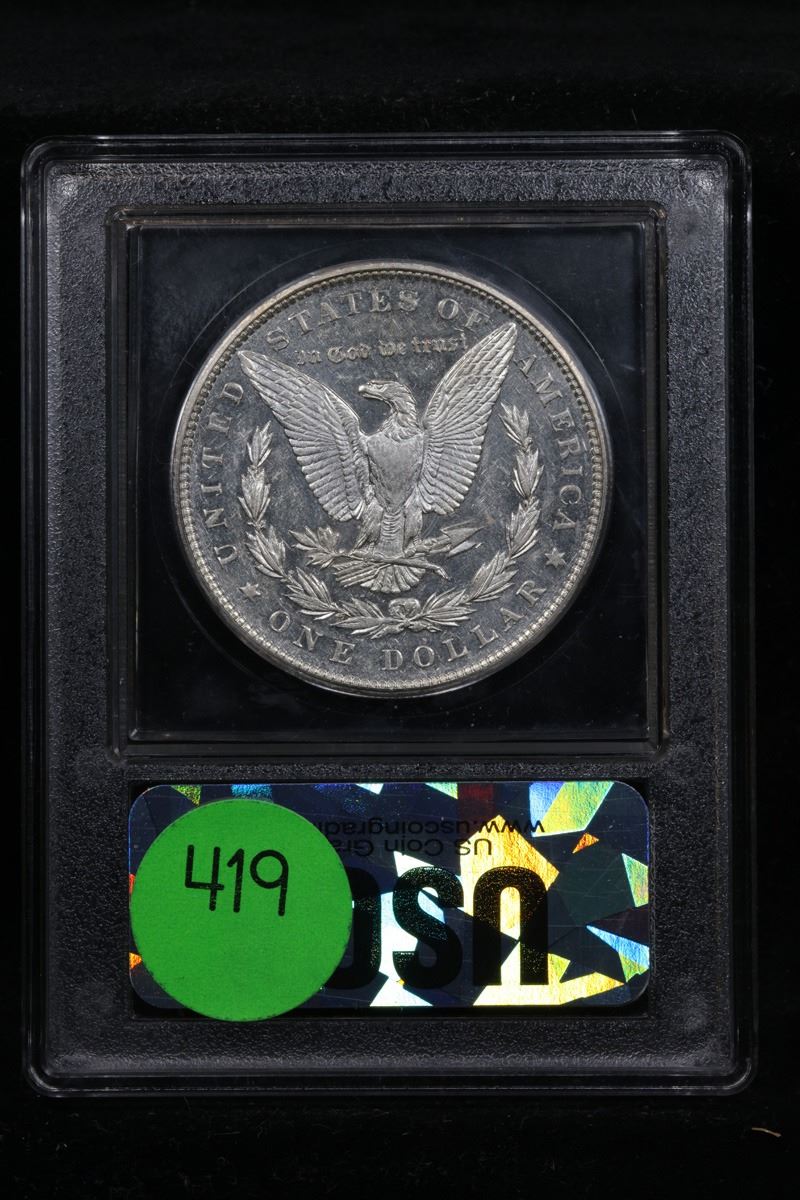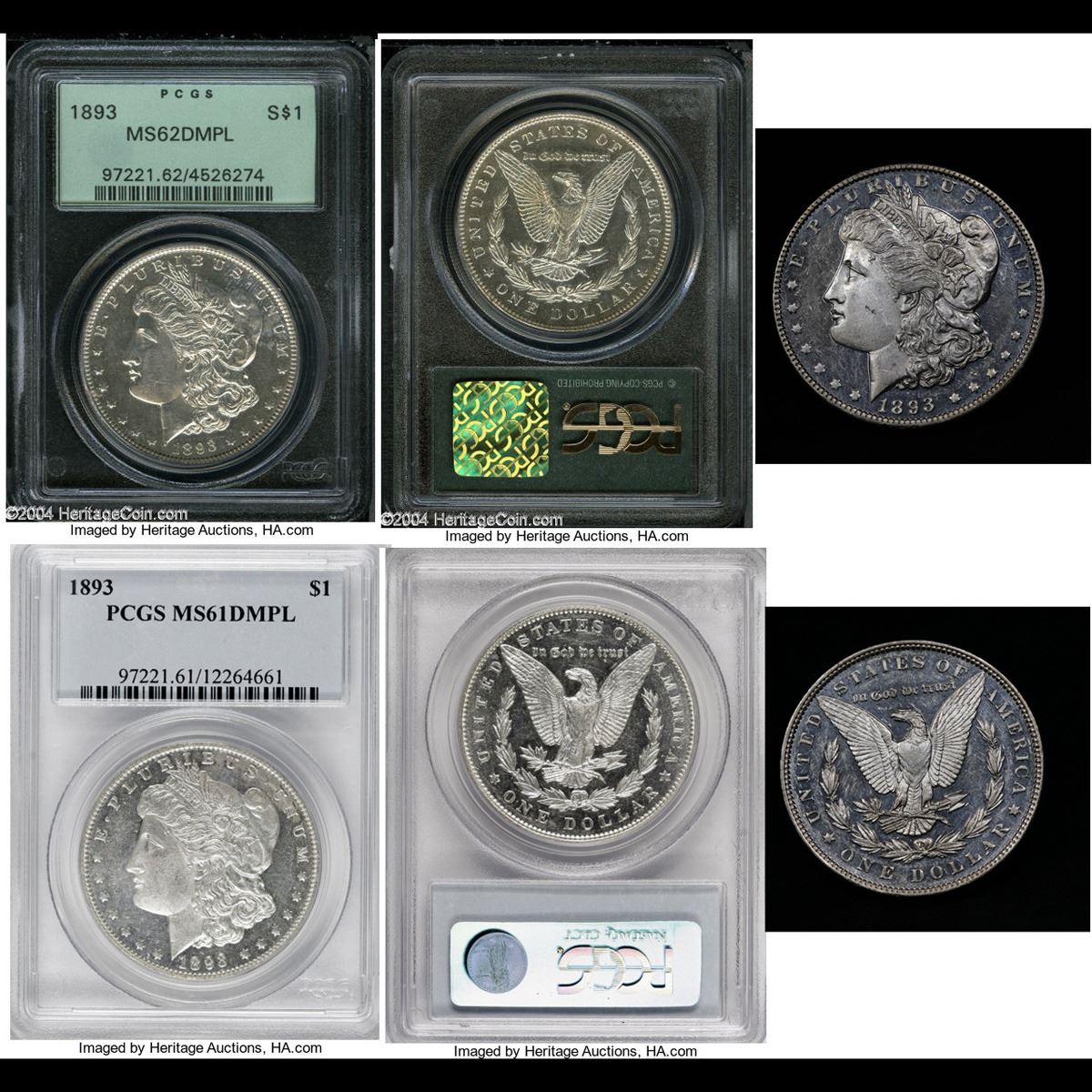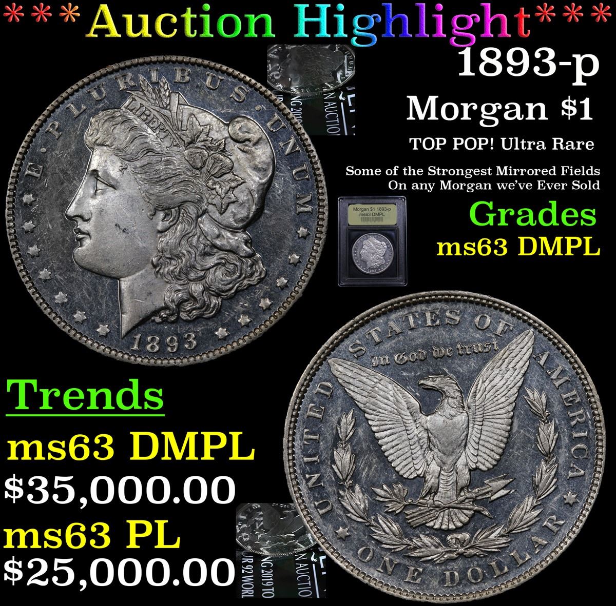 ***Auction Highlight*** 1893-p Morgan Dollar $1 Graded Select Unc DMPL By USCG. Up for Auction is a true Numismatic Rarity. An 1893-p Morgan in DMPL. Its one thing to come across a numismatic rarity in a nich type series, but to come across it in one of, if not the most widely collected series is incredible. I have never seen a DMPL in 1893 in all my years in numismatics. I could not believe it when it came upon my eyes. The Mirrored fields are just that. True Mirrors. Please closely examine the closeup mirror pics. The Cameo is superb. To Quote PCGS �Availability of proof like coins: True proof like coins are rare, and DMPL coins are exceedingly rare. Only a few exist.� To further quote them �Proof like coins: Proof like coins are very rare, and DMPL pieces are exceedingly rare.� In fact they are so rare, that in the Wholesale dealer Greysheet, no 1893-p in DMPL is even listed! PCGS estimates that 12 PL examples exist. Our coin is NO PL, it is a DMPL with sharp deep mirrors. PCGS has only ever graded 7 coins as PL, none above 62 PL. In DMPL PCGS has only ever graded 4 coins DMPL, again none above ms62 DMPL . I am including pictures of the lone ms61 dmpl and lone ms62 dmpl to go to auction. They sold for $14,950 and $14,375. One in 2008 and one in 2005. None at auction in the last 12 years�.UNTIL Tonight. I will also add that the lone ms62 DMPL, was in an OGH, Old Green Holder, and as any long time coin person will tell you, PCGS�s standards for PL and DMPL years ago, when they used the Old Green Holder was much less strict than today. I am 100% certain that that ms62 DMPL if graded today would not get DMPL, it might not even get PL. Trends on an ms62 DMPL is $25,000. I do believe you are looking at the single finest known 1893-p DMPL. I wish you good fortune and good luck in securing this once in a lifetime opportunity. It has been a true pleasure to be its caretaker this past month. A Corey's Pick, Bid to Win, Don't let it get Away, you might not find its equal Coin. I give this coin my highest recommendation